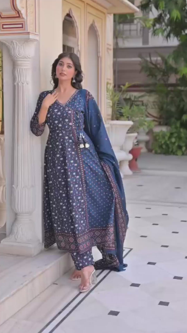 Graceful Blue Rayon Anarkali Dress with Intricate Prints →