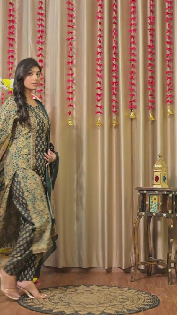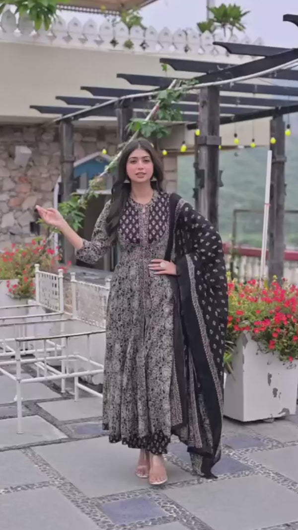 IndoLady Emerald Charm Cotton Flared Anarkali Set with Handwork & Dupatta →