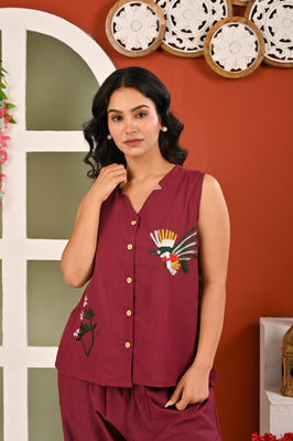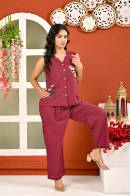 Wine Grace Sleeveless Cotton A-line Suit Set with Embroidered Dupatta
