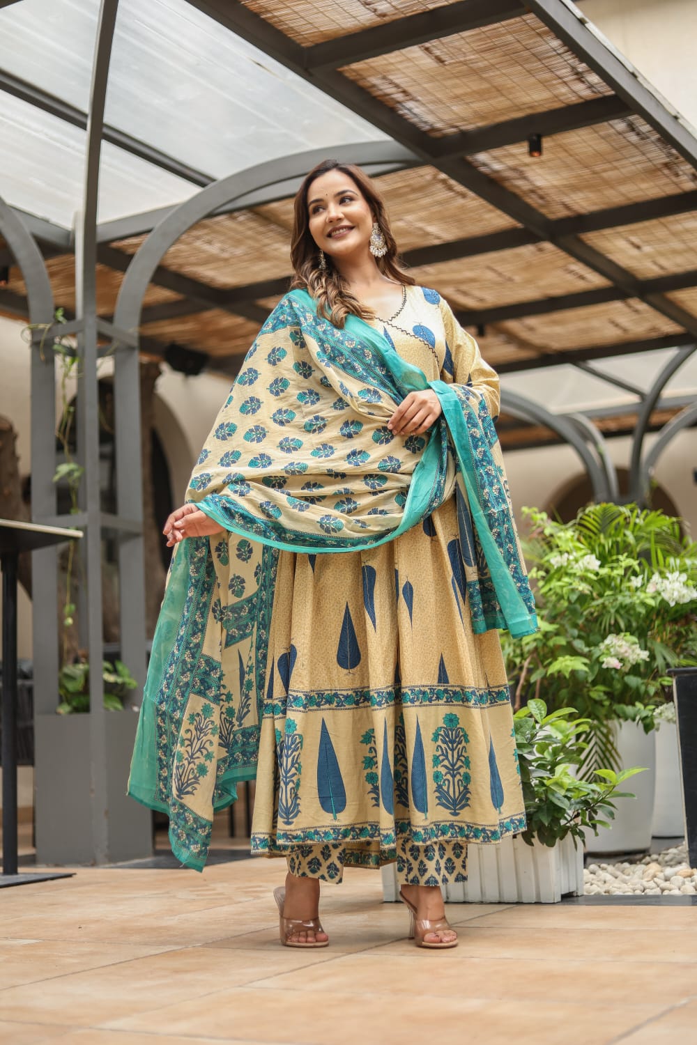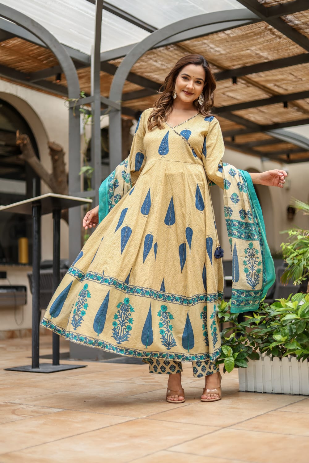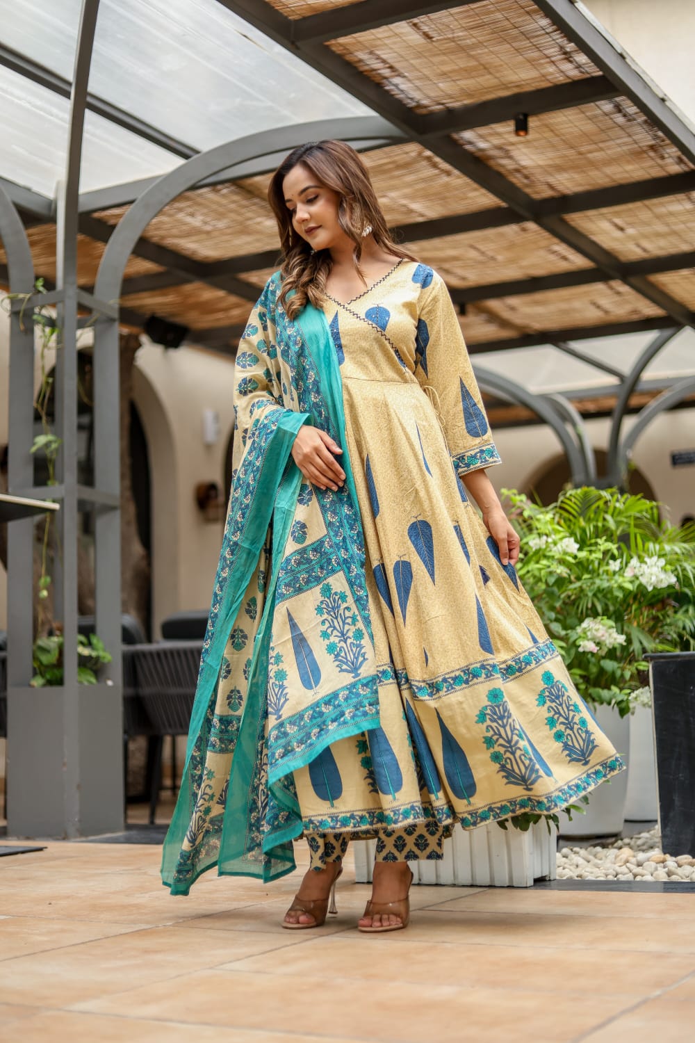 Step into the season with grace, heritage, and comfort with our Graceful Glamour: Pure Cotton Anarkali Suit Set an ode to timeless Indian craftsmanship. Thoughtfully designed in a rich terracotta hue, this full Anarkali dress is made from 100% pure cotton, ensuring all-day breathability and softness — perfect for India's summer and transitional weather.