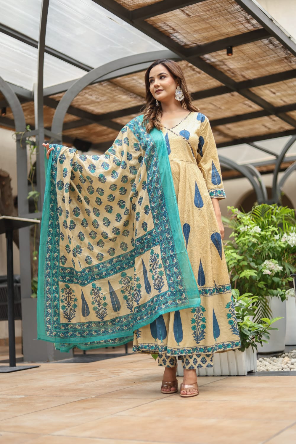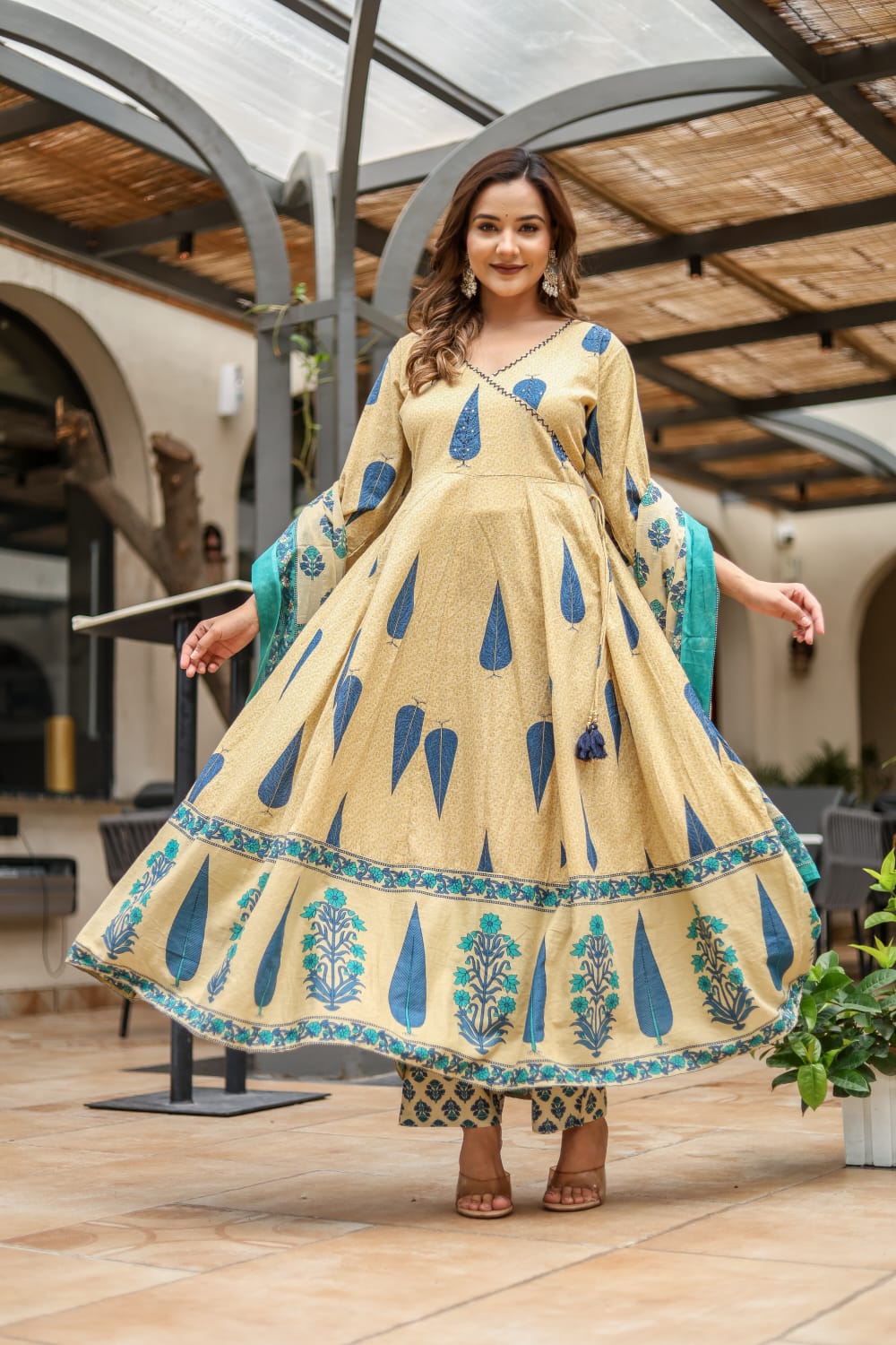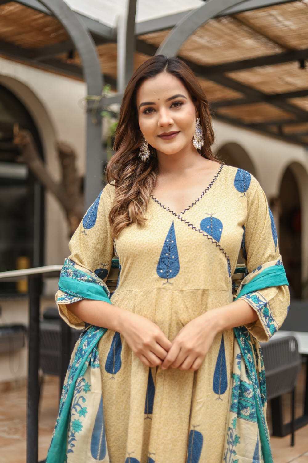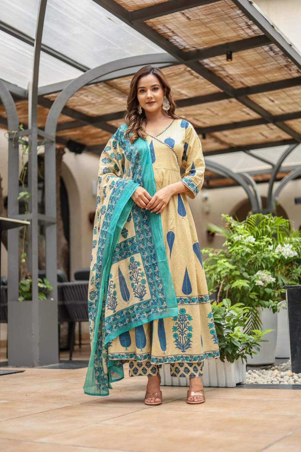 Step into the season with grace, heritage, and comfort with our Graceful Glamour: Pure Cotton Anarkali Suit Set an ode to timeless Indian craftsmanship. Thoughtfully designed in a rich terracotta hue, this full Anarkali dress is made from 100% pure cotton, ensuring all-day breathability and softness — perfect for India's summer and transitional weather.