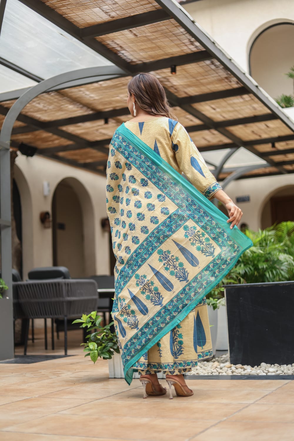 The dress features authentic hand block prints, intricately laid out in a swirling, symmetrical pattern that adds a striking yet earthy charm. These traditional prints are not just decorative; they are a celebration of artisanal heritage, hand-stamped with care, bringing a unique story to every piece.
