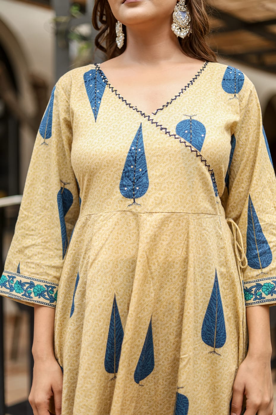 The silhouette follows a full Anarkali pattern — flowing, flared, and feminine. With its relaxed fit, short sleeves, and structured collar neckline, the dress strikes the perfect balance between ethnic tradition and contemporary fashion. Whether you’re heading to a family get-together, a festive celebration, or just out for a stylish day, this piece moves with elegance and ease.