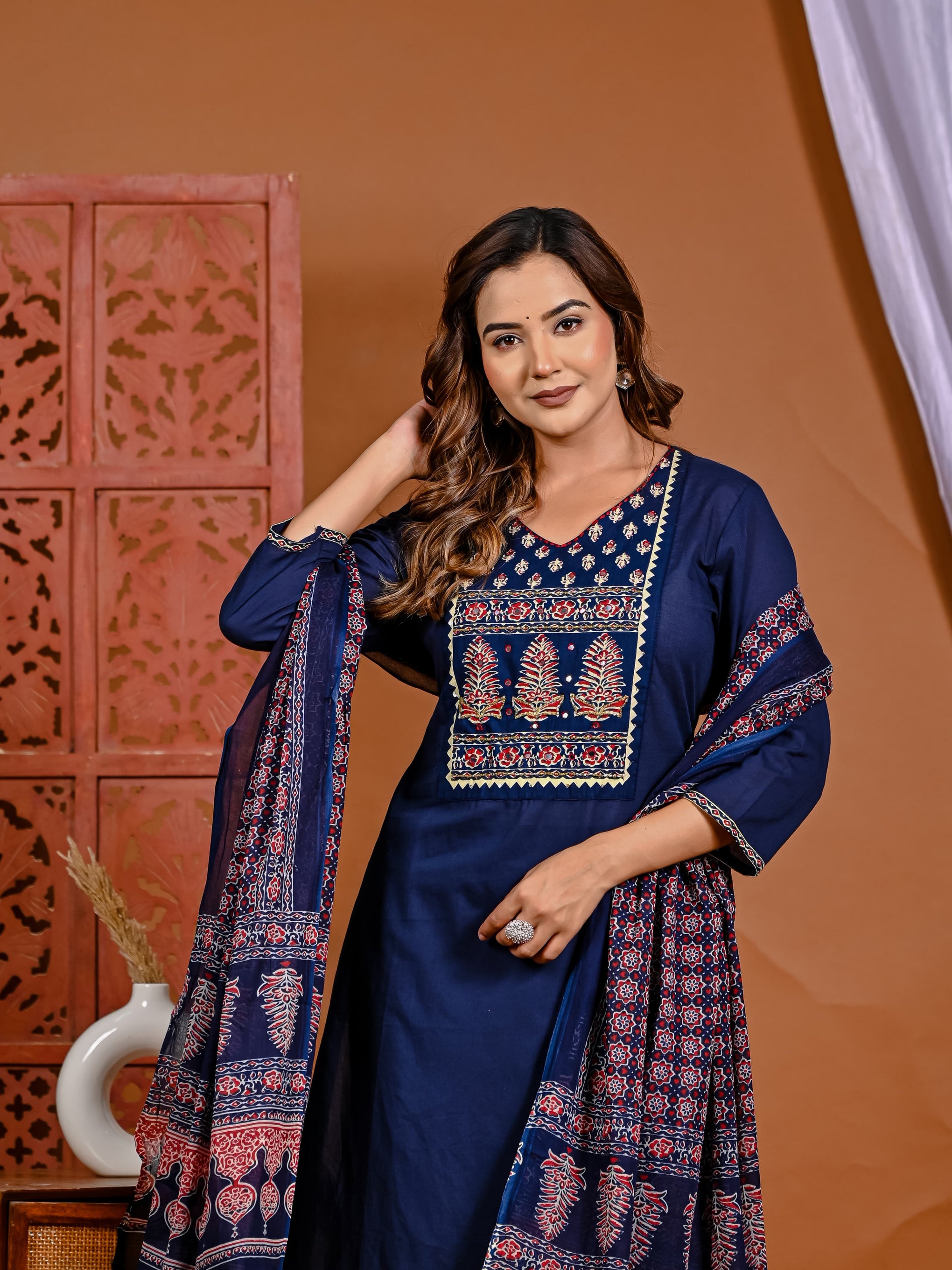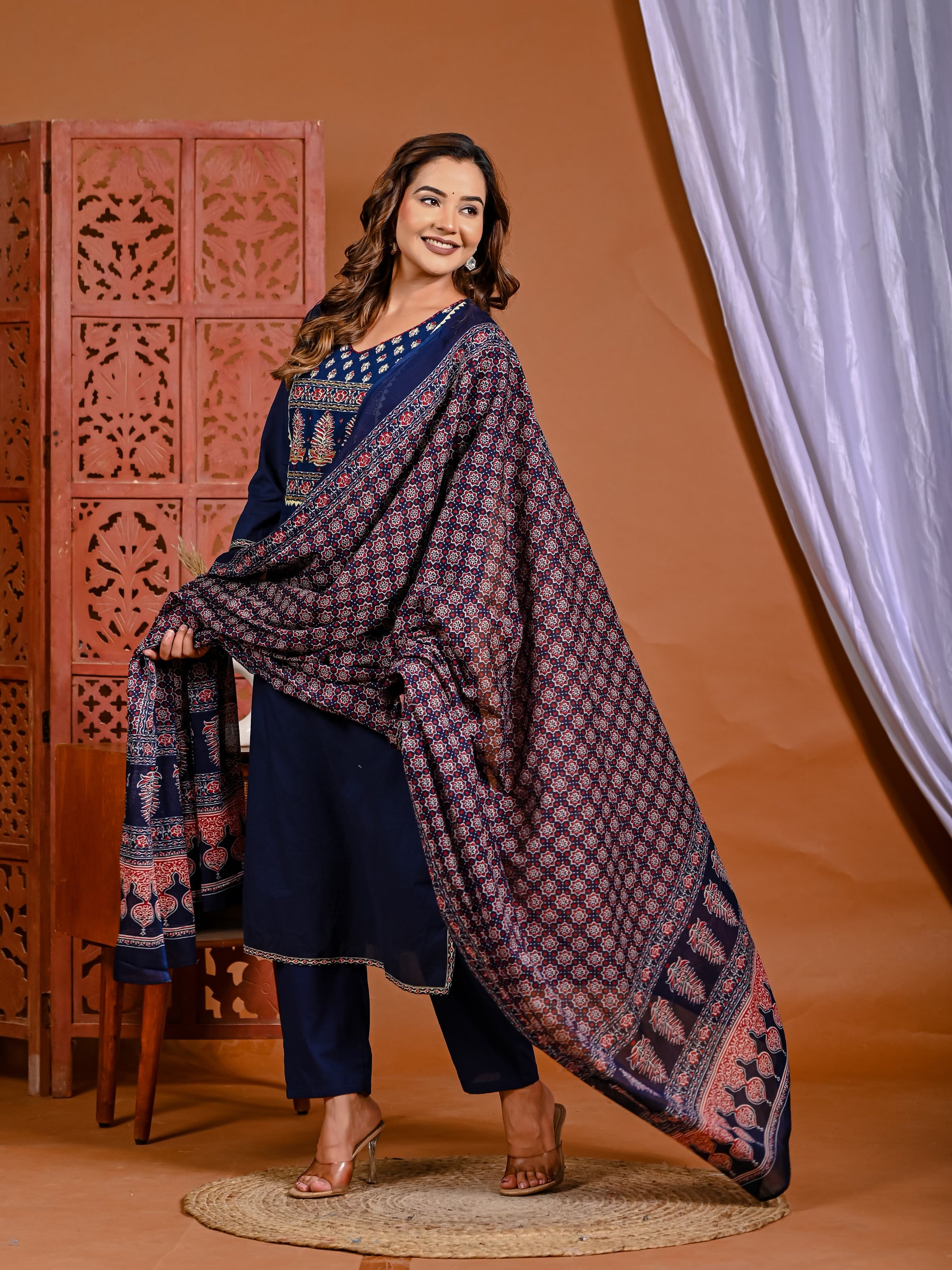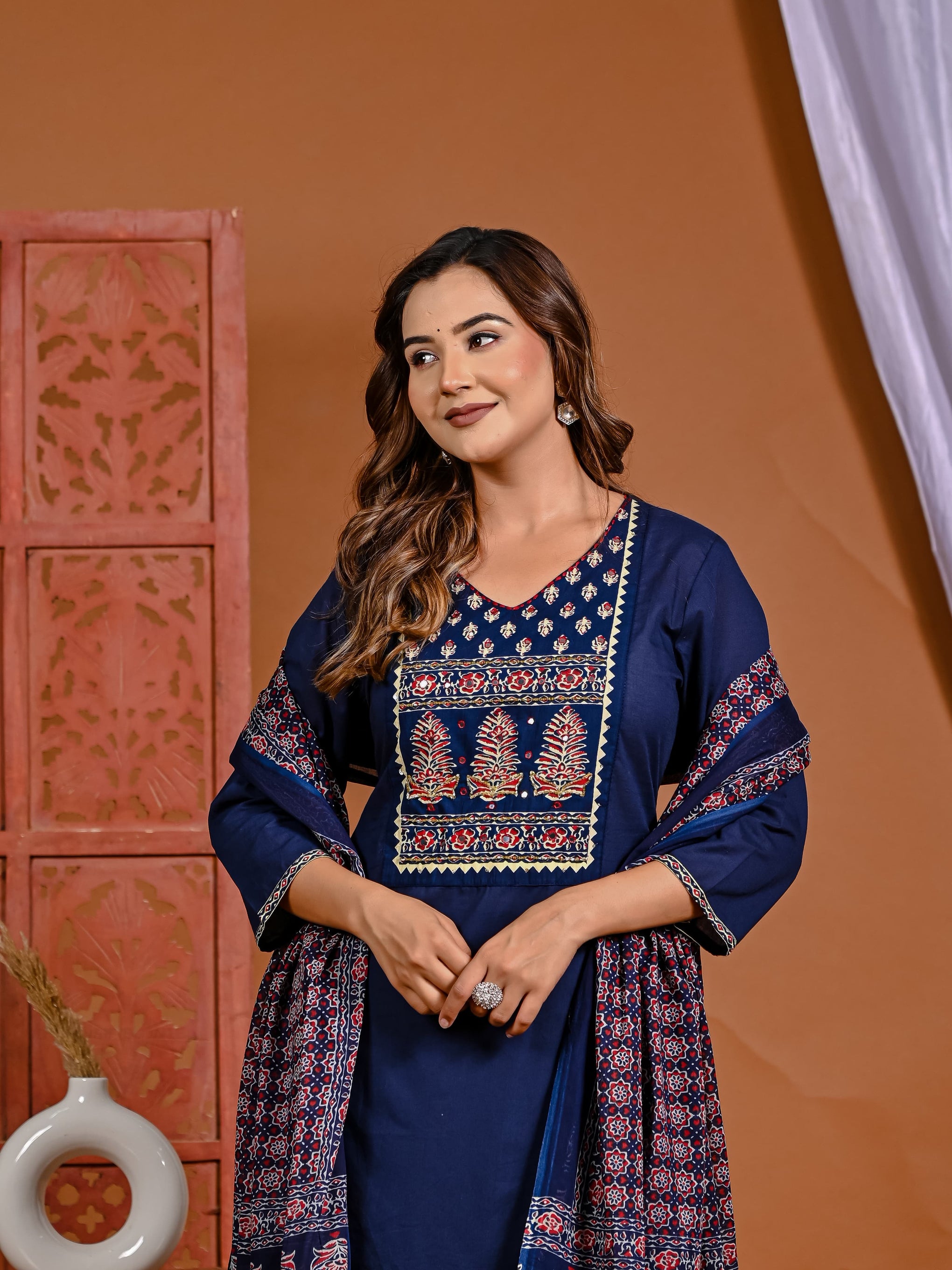 Step into timeless elegance with our Navy Blue Pure Cotton Kurta Set, crafted for women who appreciate tradition blended with style. This ensemble features: