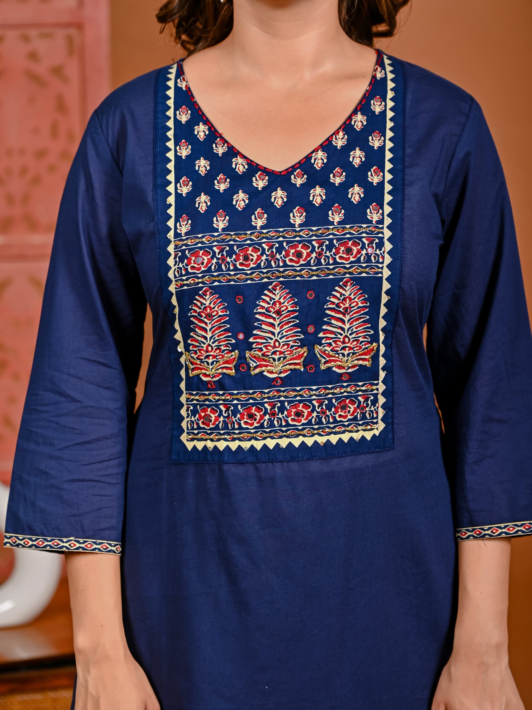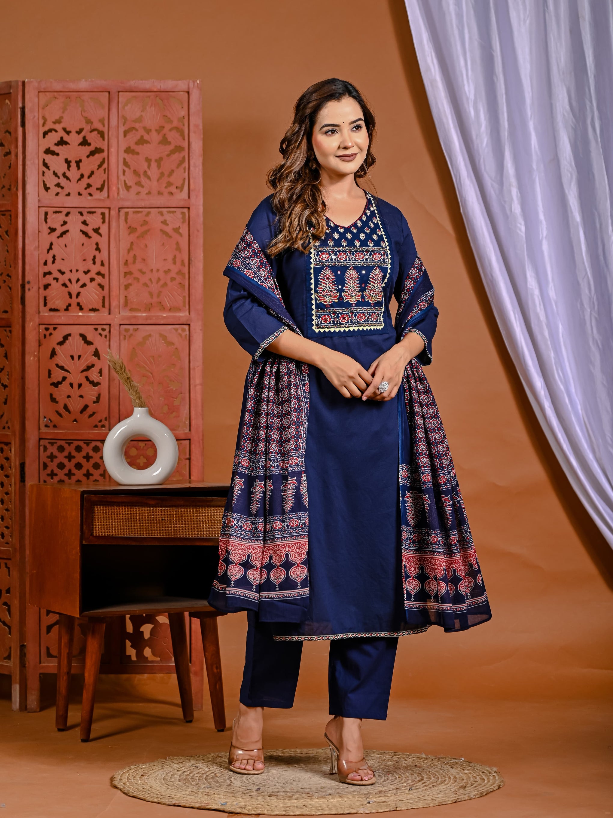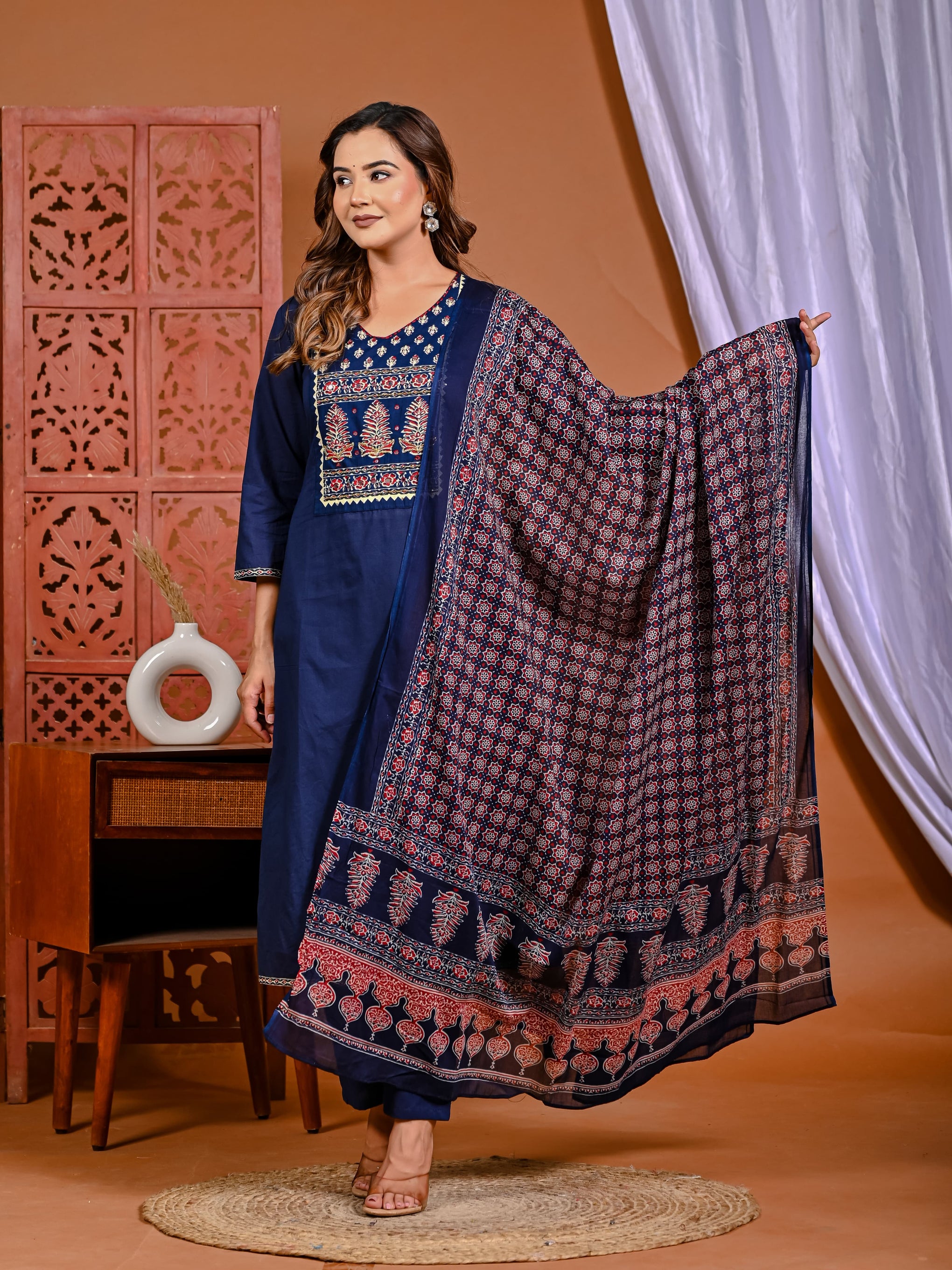 Step into timeless elegance with our Navy Blue Pure Cotton Kurta Set, crafted for women who appreciate tradition blended with style. This ensemble features: