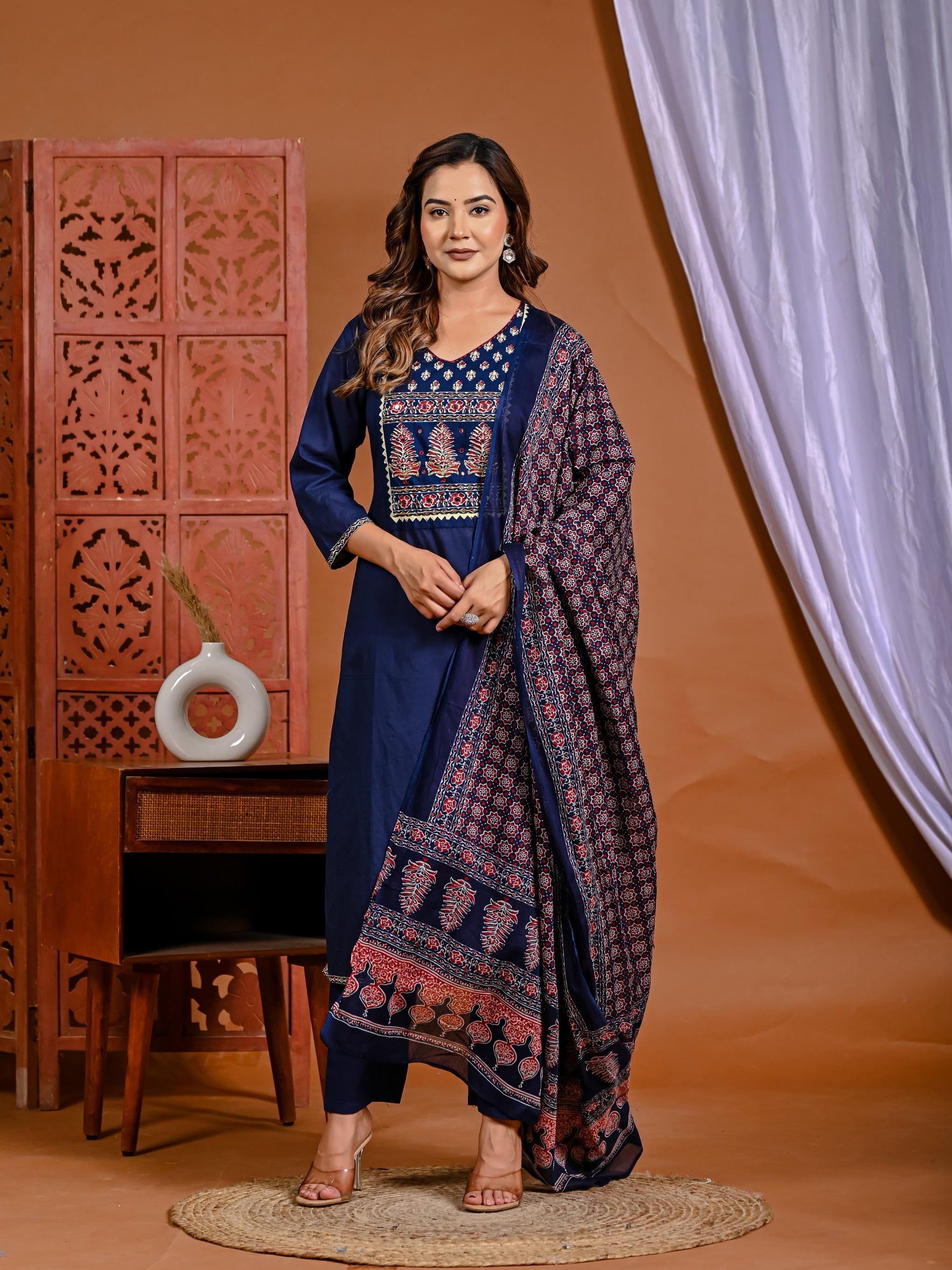 Whether you’re heading to an office meeting, festive occasion, or casual gathering, this navy blue outfit ensures grace, comfort, and confidence. Pair it with ethnic jewelry and heels for a chic traditional look.