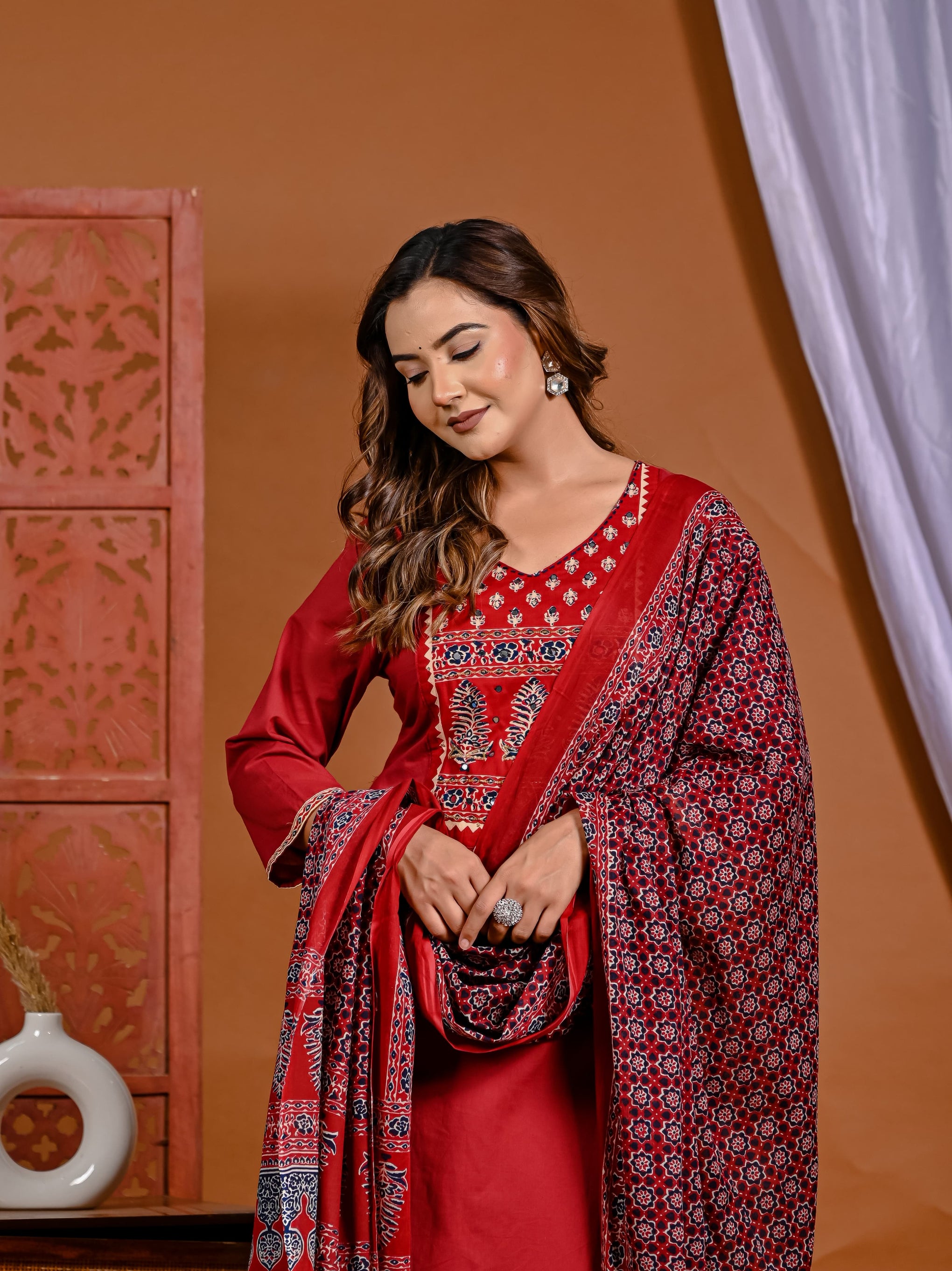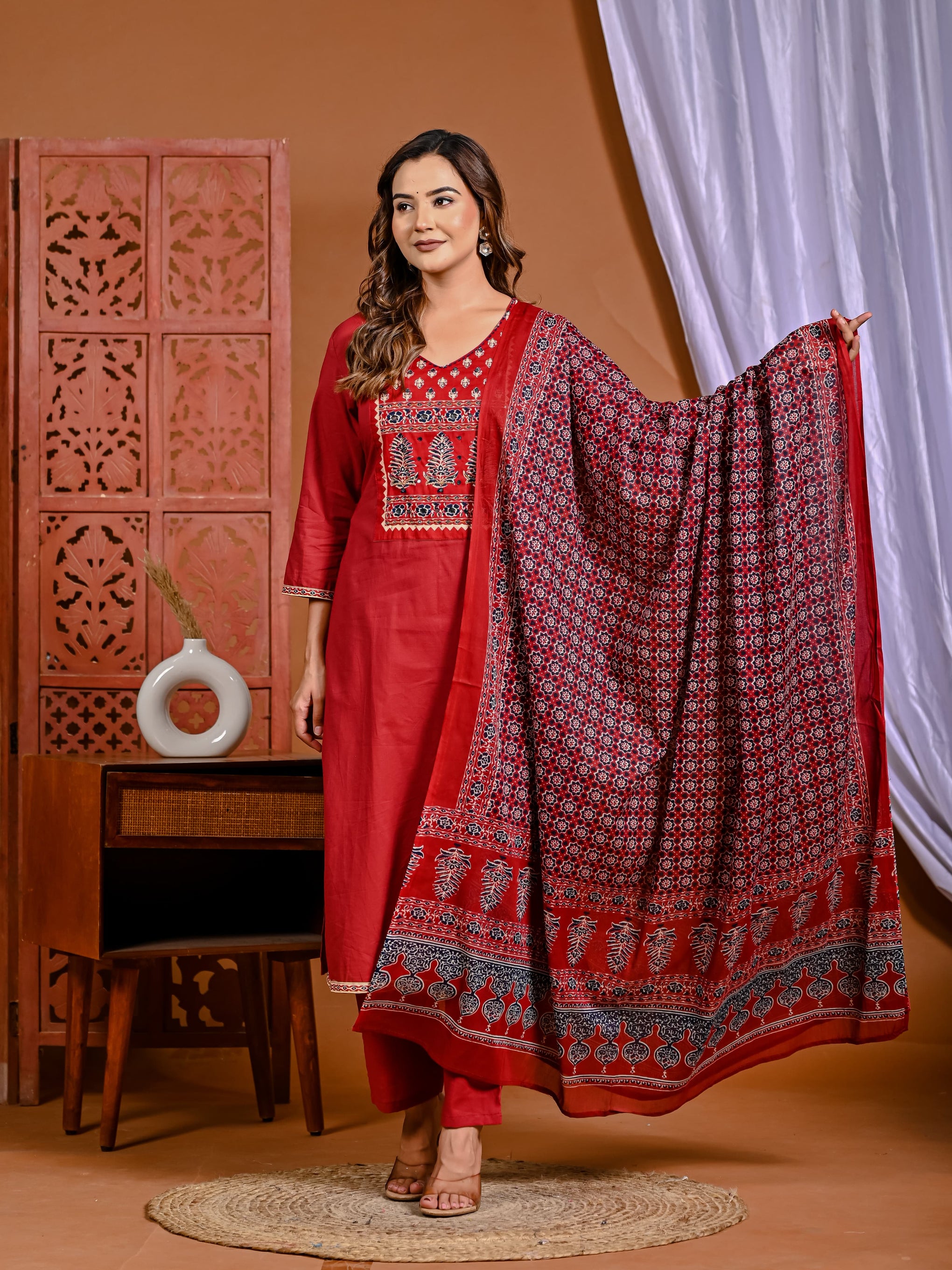 Perfect for festive celebrations, office events, or casual outings, this red ensemble gives you the confidence to shine bright. Pair it with statement jewelry and ethnic footwear for the ultimate look.