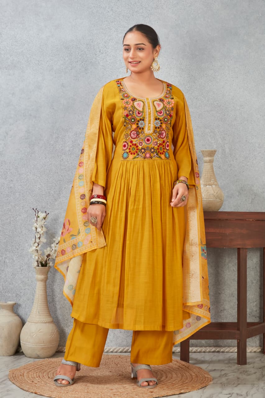 Make every celebration special with our Pure Mul Chanderi Suit Set. Designed for elegance and comfort, this outfit blends traditional craftsmanship with modern festive vibes. The hand-embellished neckline work adds a touch of regal charm, while the lightweight Chanderi fabric ensures all-day comfort.