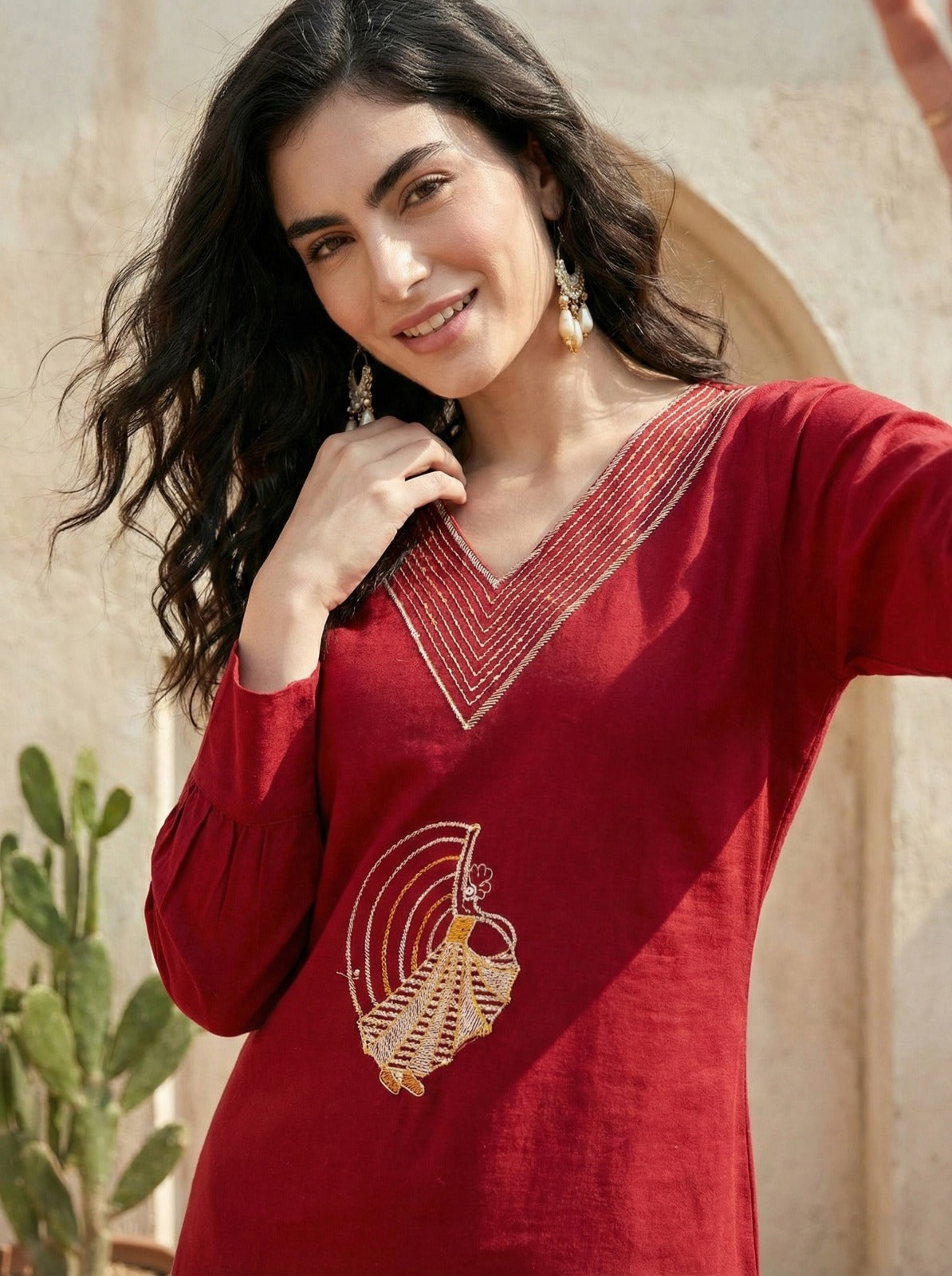 The kurti features a flattering straight A-line silhouette that complements all body types and ensures a graceful fall. The stylish V-neckline with fine detailing enhances the overall design, while the artistic embroidered motif inspired by traditional dance forms adds a unique cultural touch to the outfit. The intricate embroidery creates a sophisticated visual appeal, making the kurti perfect for both casual and semi-festive occasions.