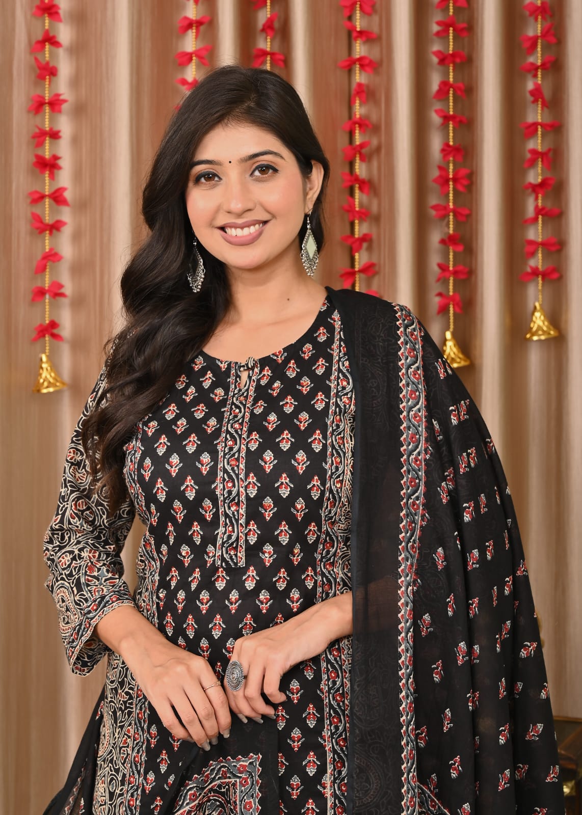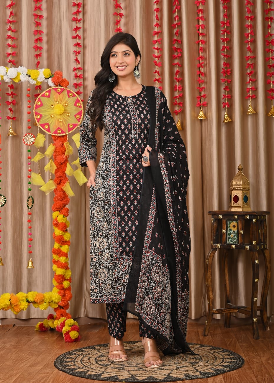 The handcrafted detailing on the neckline adds a refined touch of artistry, while the black base with delicate prints creates an enchanting contrast perfect for both festive gatherings and formal occasions. The premium cotton fabric ensures softness, breathability, and all-day comfort, making this set a must-have in every woman’s ethnic wardrobe.