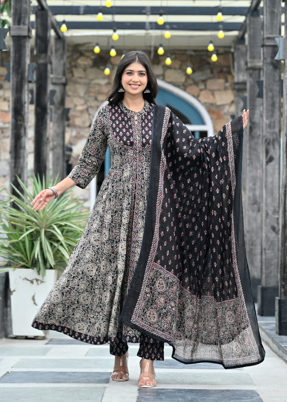 Unveil a statement of sophistication with IndoLady’s Noir Royale Flared Cotton Suit Set, a mesmerizing fusion of comfort, tradition, and craftsmanship. Designed in a deep black base with intricate ethnic block-inspired prints, this flared kurta radiates timeless appeal. The fine handwork accents add a touch of luxe, while the full-flared design enhances your silhouette gracefully. The matching pant and flowy printed dupatta make this a complete, elegant ensemble.