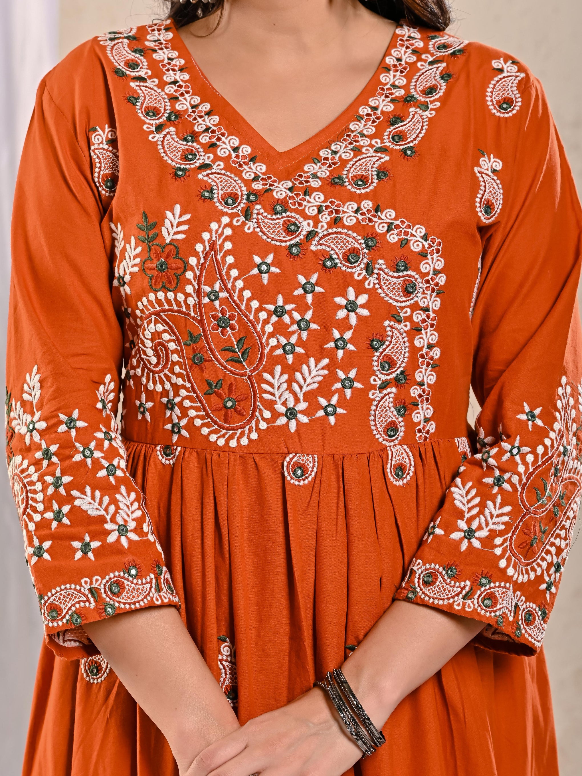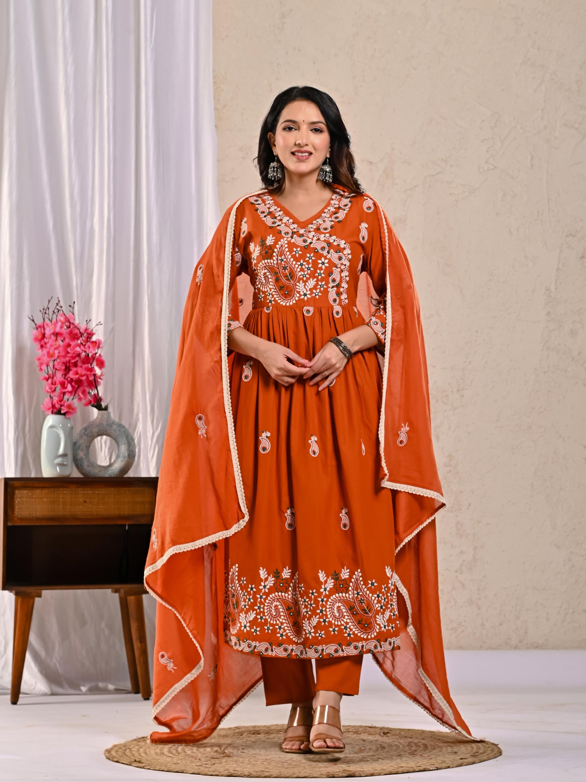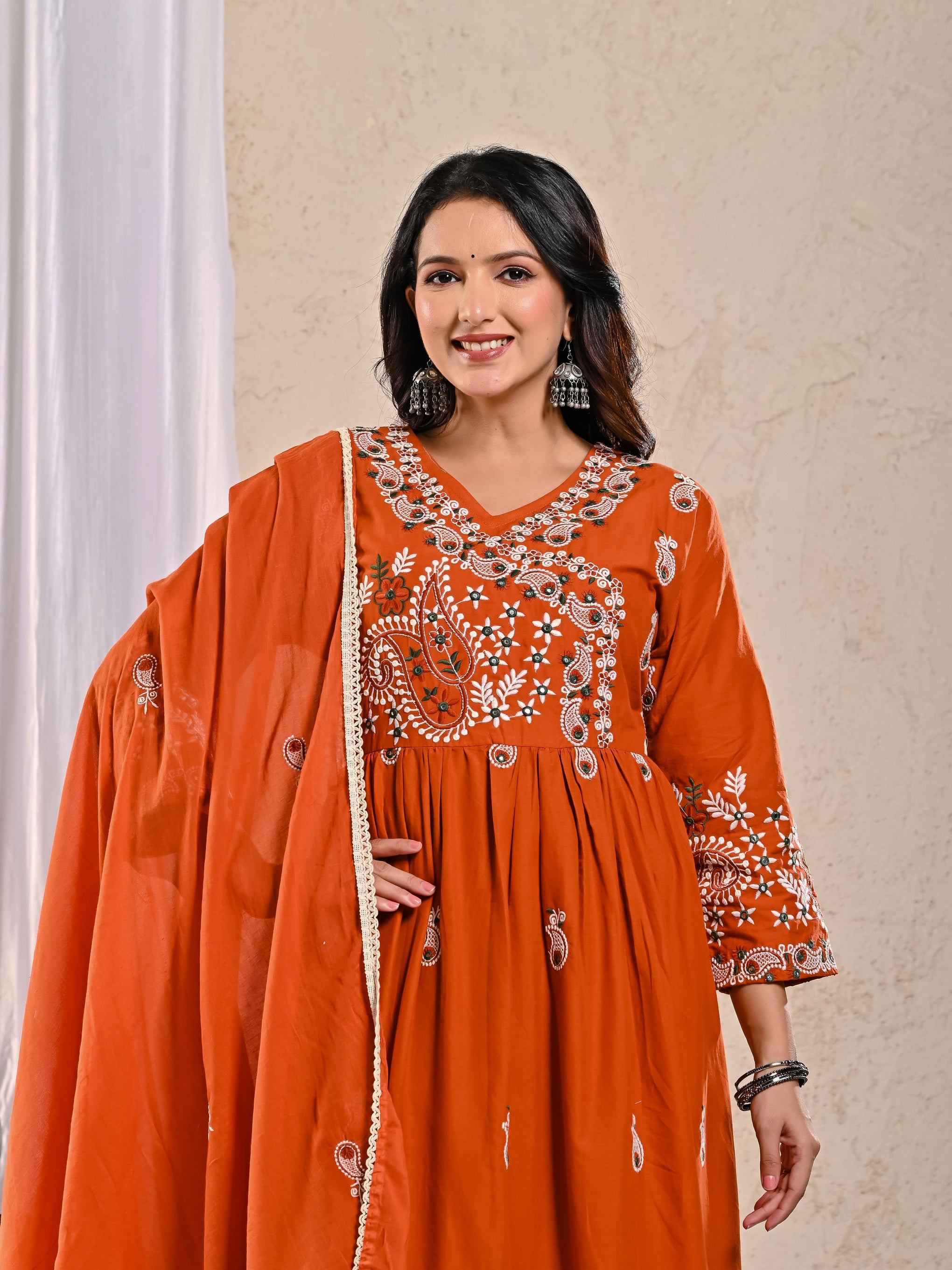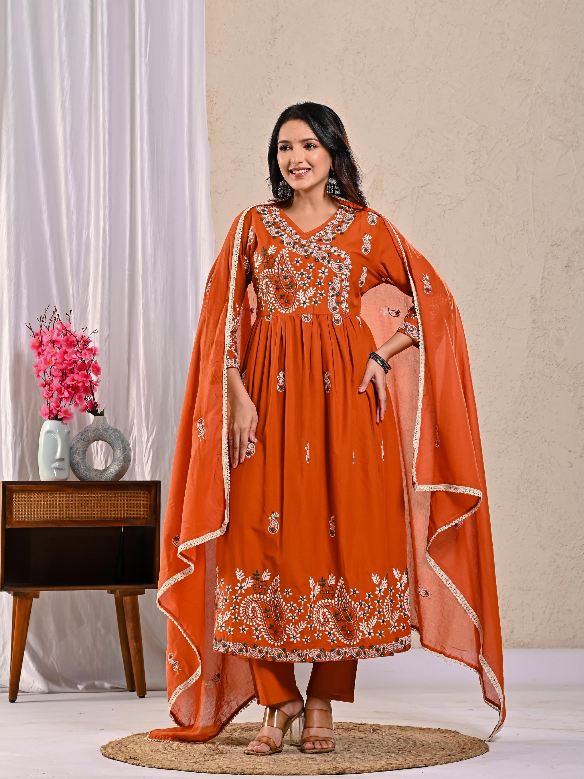 Crafted in premium pure cotton, this suit set is designed to keep you effortlessly stylish and comfortable throughout the day. The flowy Anarkali silhouette flatters every body type, making it an ideal choice for women who love elegance with ease.