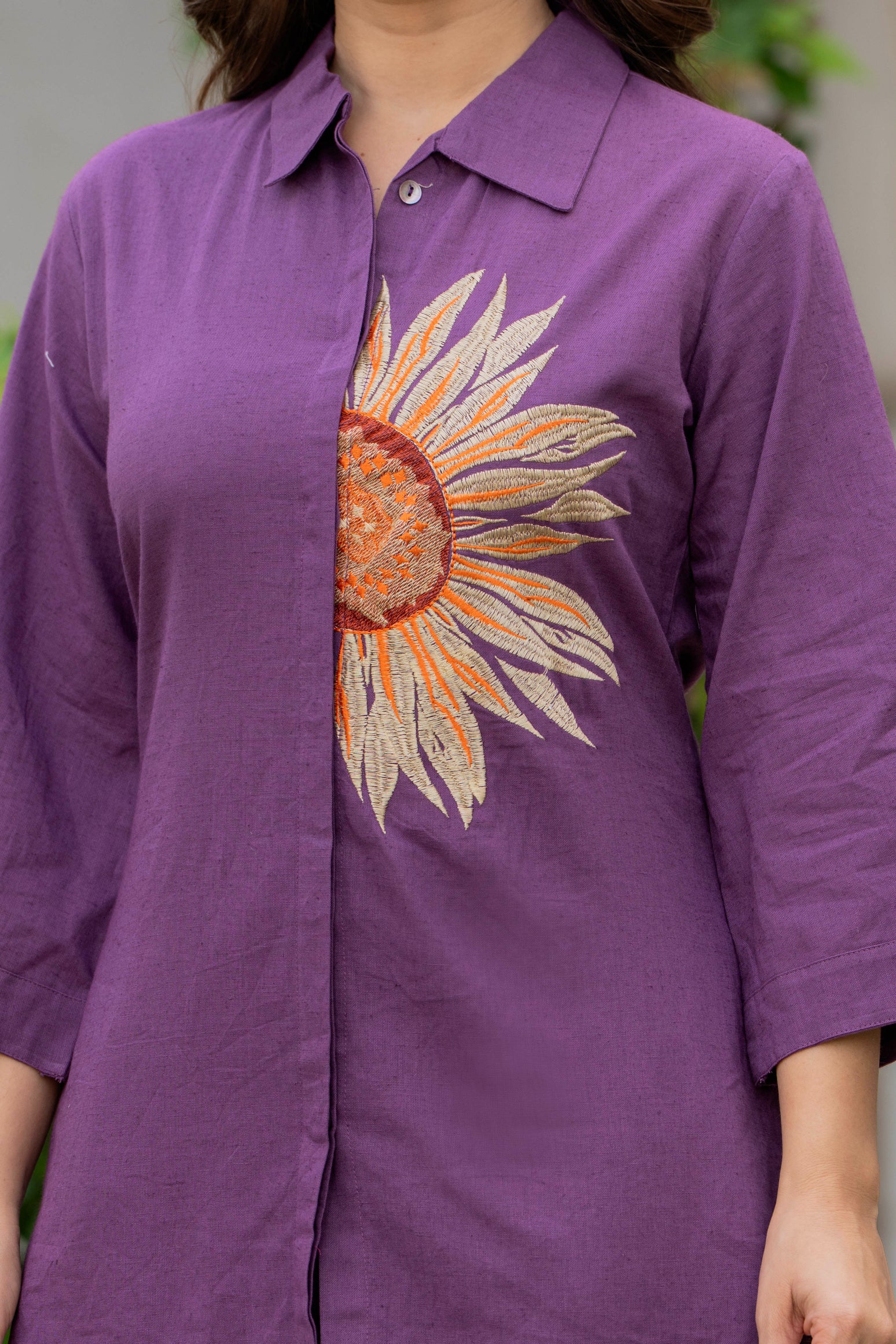Made from high-quality cotton flex fabric, the outfit promises breathability, durability, and all-day comfort. The highlight of the ensemble is the beautifully hand-embroidered sunflower motif on the top — a symbol of confidence and warmth. This embroidery adds a vibrant pop to the minimalist silhouette, making it equally suitable for formal meetings, festive brunches, or casual evening outings.