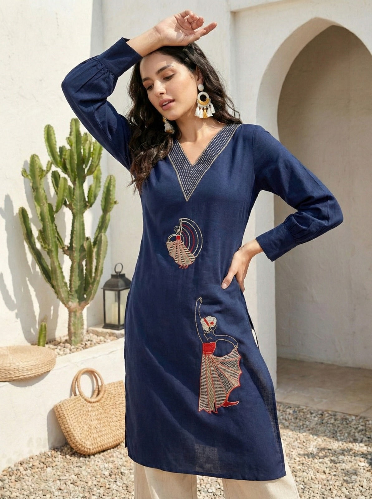 The kurti features a flattering straight A-line silhouette that complements all body types and ensures a graceful fall. The stylish V-neckline with fine detailing enhances the overall design, while the artistic embroidered motif inspired by traditional dance forms adds a unique cultural touch to the outfit. The intricate embroidery creates a sophisticated visual appeal, making the kurti perfect for both casual and semi-festive occasions.