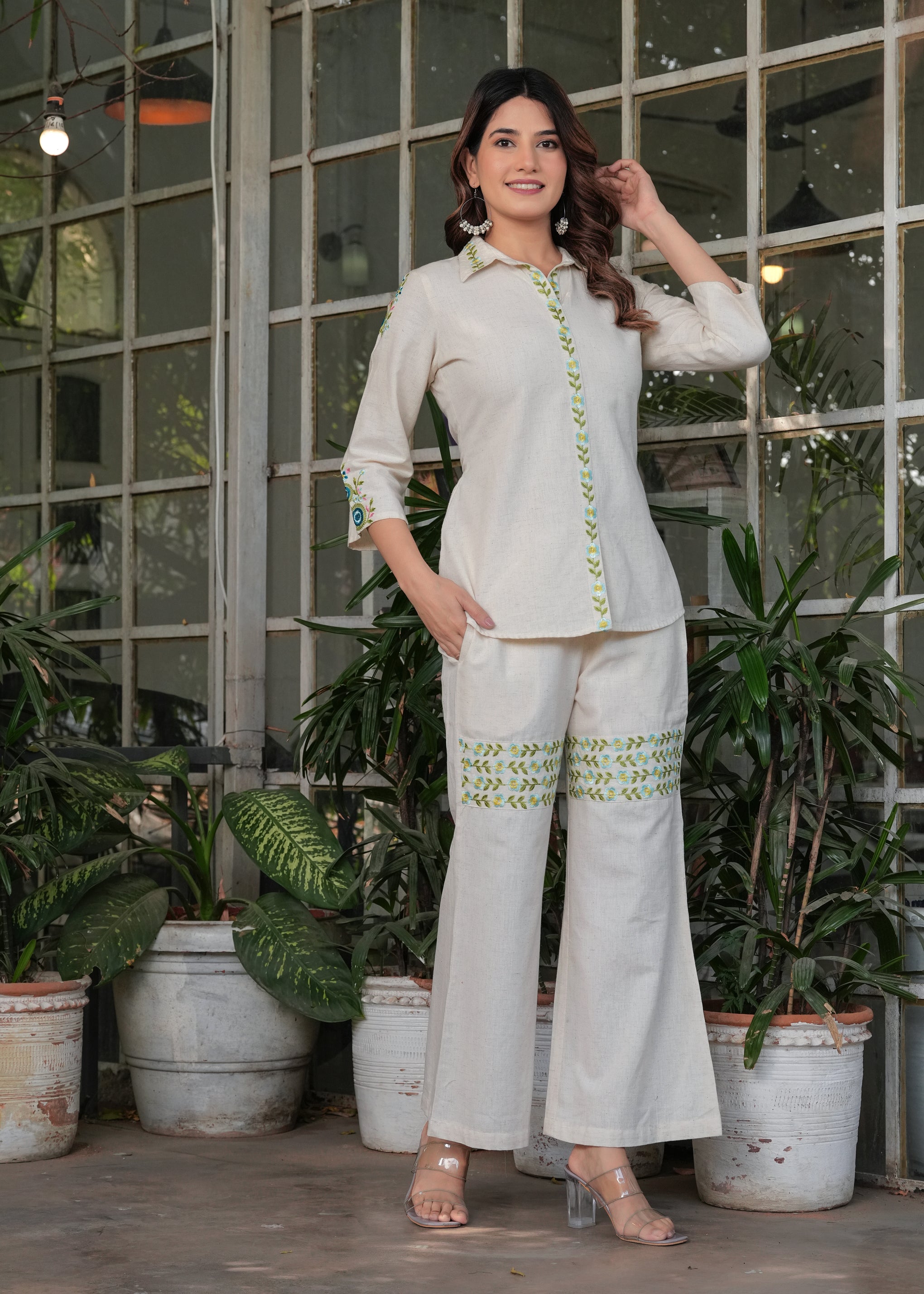 The collared straight-cut top comes with 3/4th sleeves and elegant floral work along the placket, while the flared straight pants carry coordinated leaf-style embroidery bands that flatter the silhouette.
