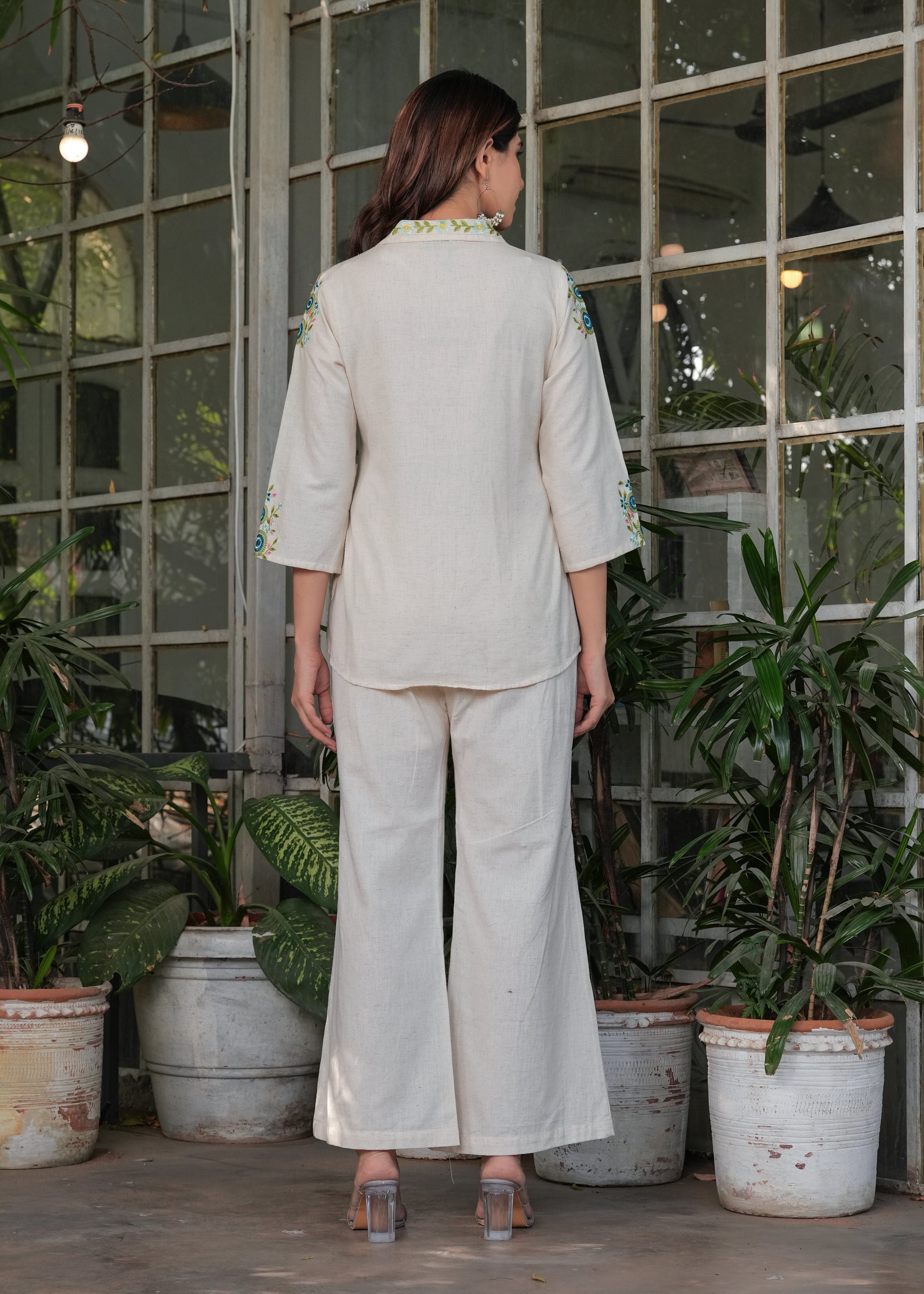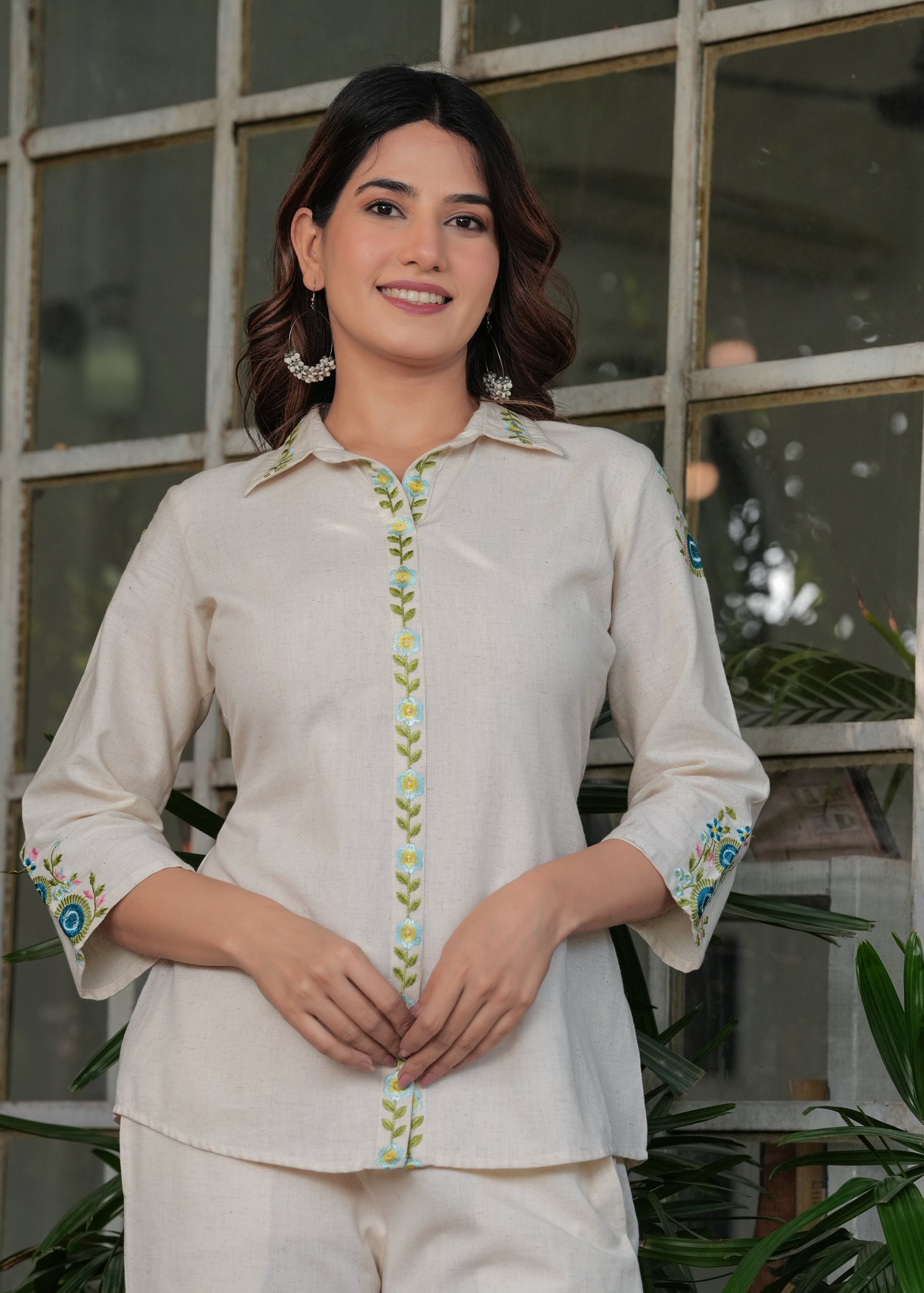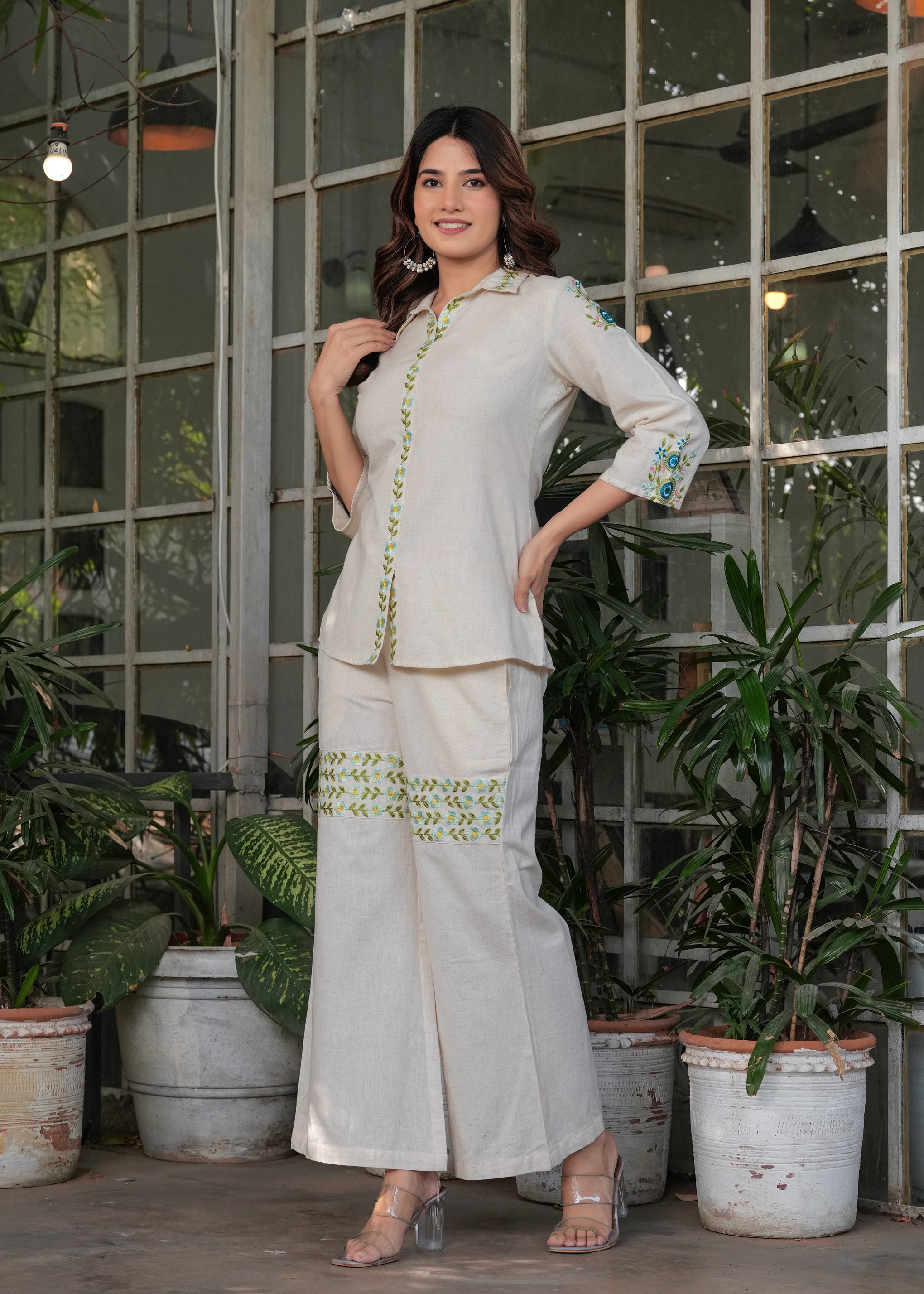 The off-white/ivory-toned outfit is elevated with delicate multi-thread embroidery on the collar line, sleeve hems, and pant panels – offering a unique touch of ethnic finesse while maintaining a clean, contemporary vibe.