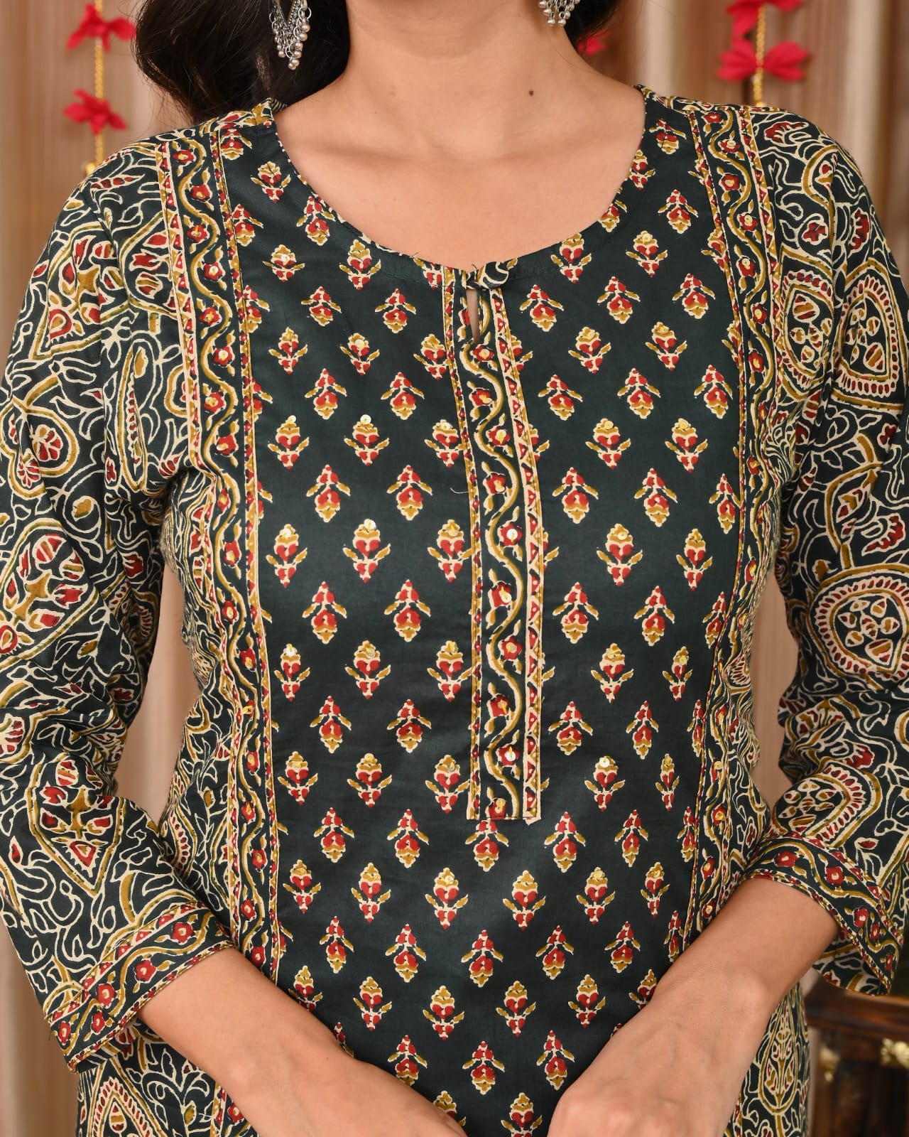 Step into timeless elegance with IndoLady’s Bottle Green Cotton Suit Set (K3049) — a perfect blend of sophistication, comfort, and traditional charm. Crafted from premium breathable cotton, this three-piece set includes a straight-fit kurta, matching pant, and a beautifully printed dupatta. The kurta features a graceful ethnic motif print all over, highlighted with intricate handwork around the neckline, giving it a touch of luxury.