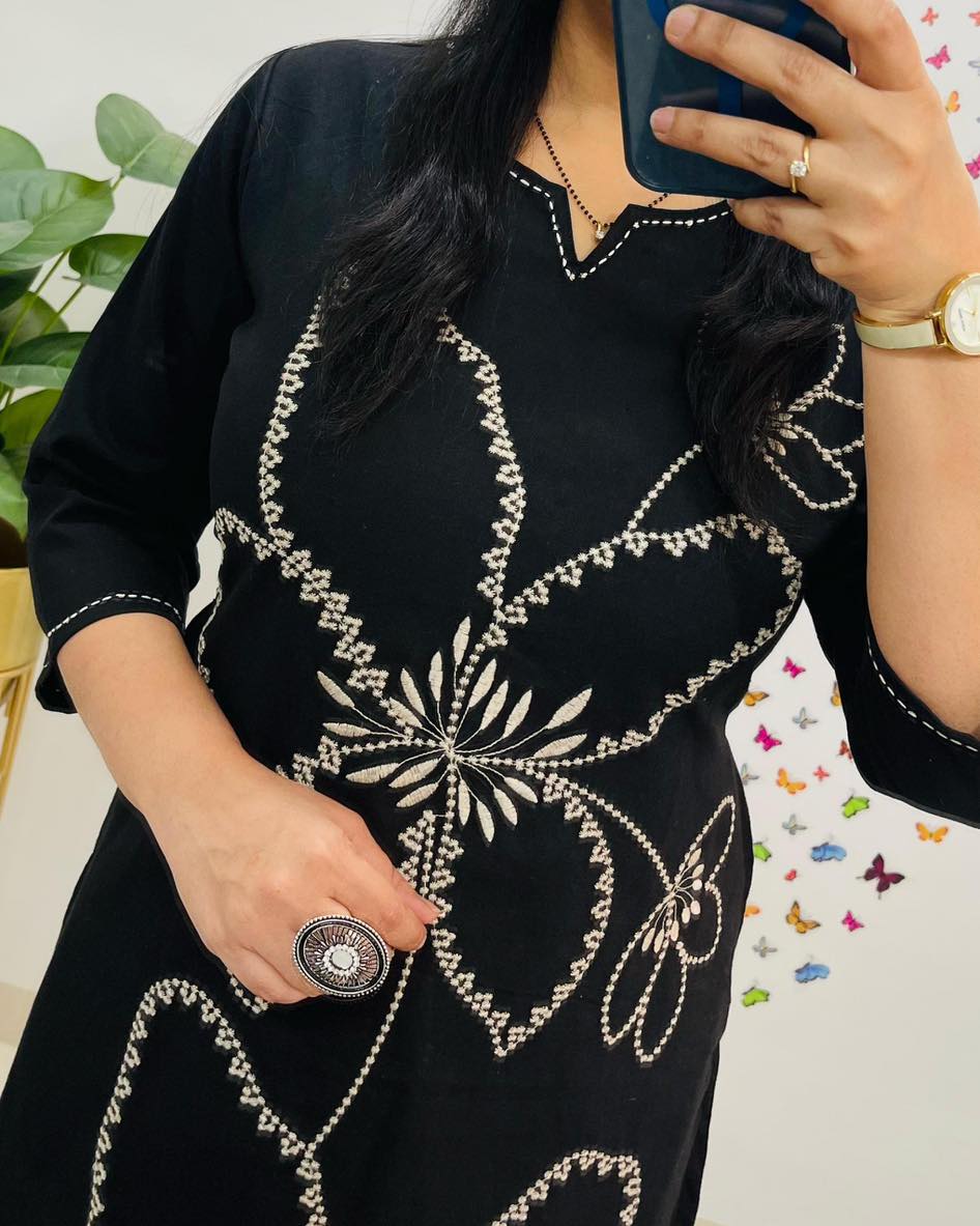 Indolady’s Noor Co-ord Set in deep Black is designed to turn everyday moments into something special. Crafted from breathable pure cotton and detailed with intricate Aari embroidery, this set features oversized floral motifs that make a subtle yet striking statement.
