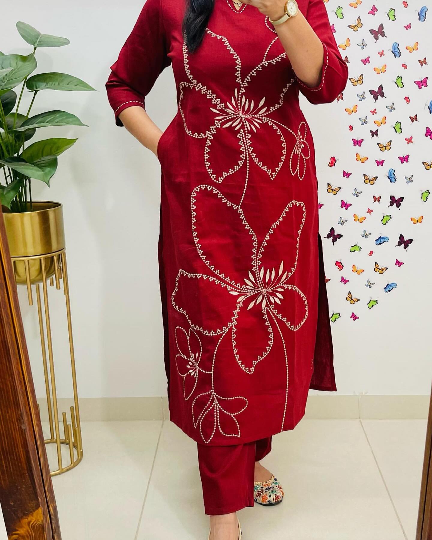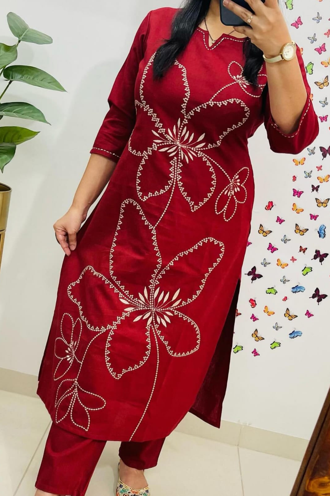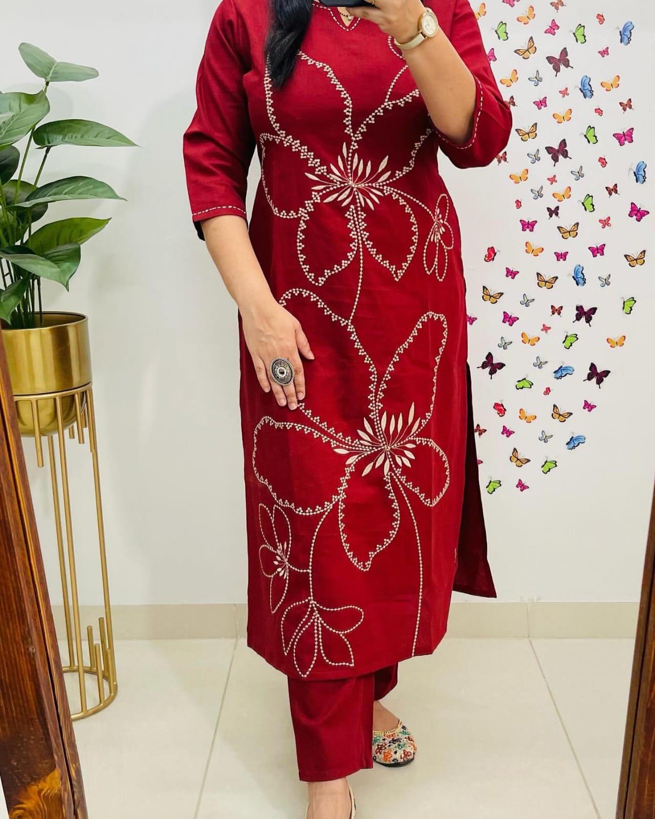 Indolady’s Noor Co-ord Set in deep maroon is designed to turn everyday moments into something special. Crafted from breathable pure cotton, and detailed with intricate Aari embroidery, this set features oversized floral motifs that make a subtle yet striking statement.