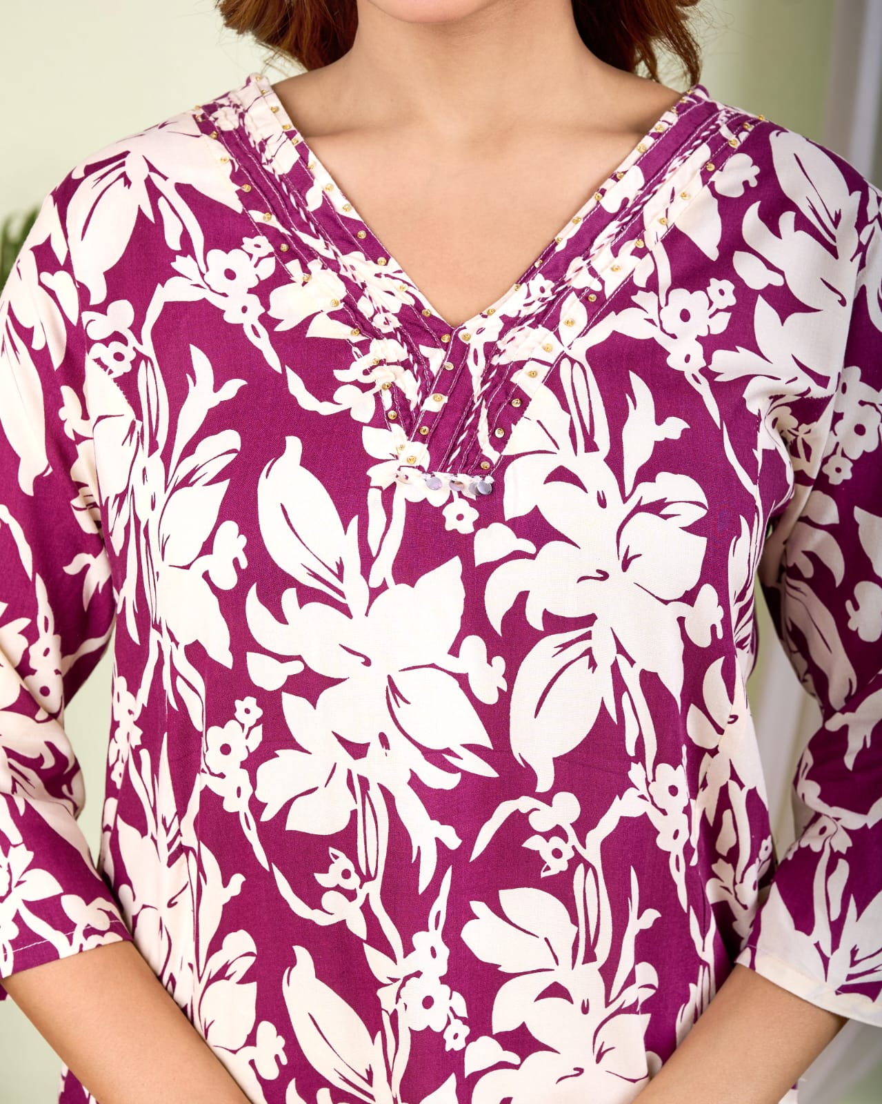• Neckline: Stylish V-neck with detailing
