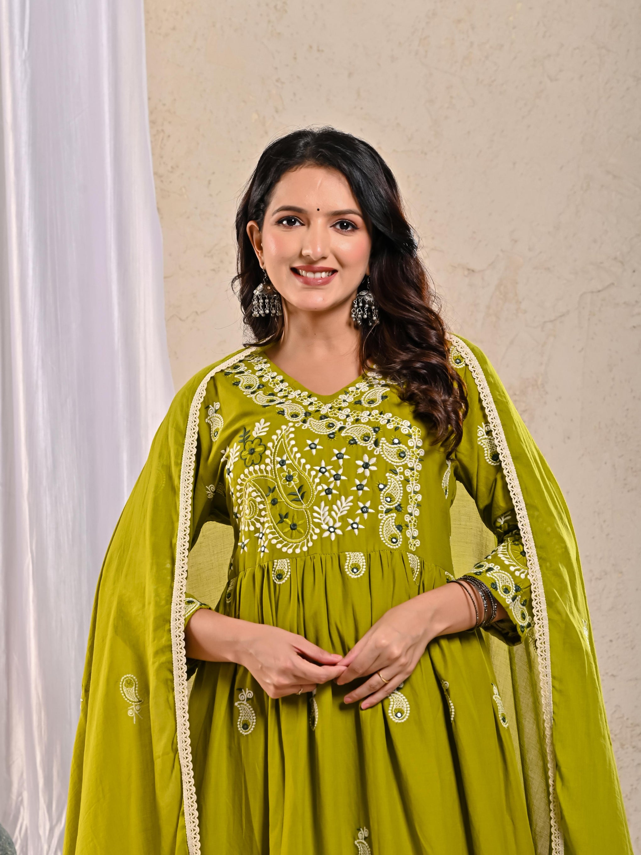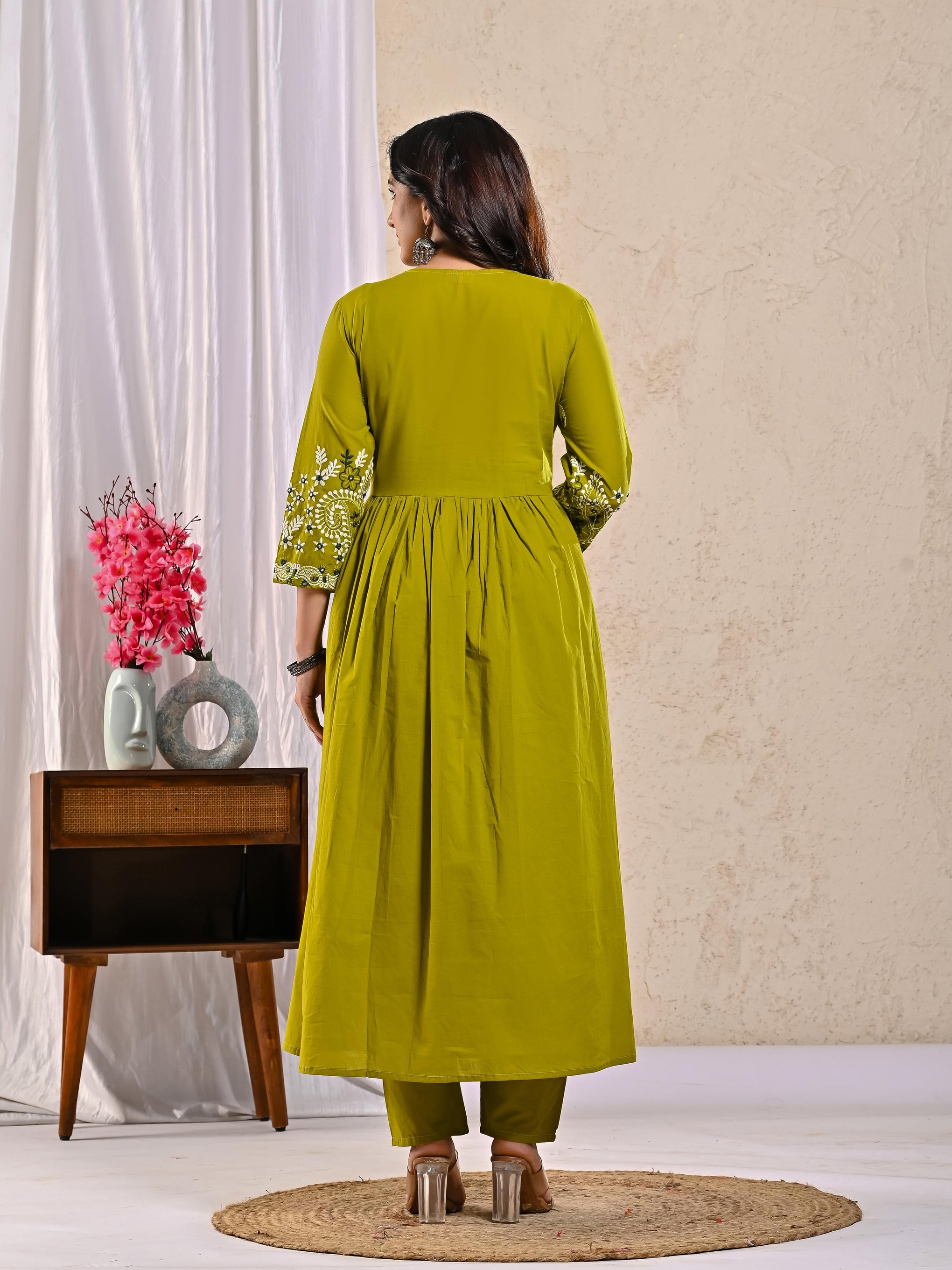 Crafted in premium pure cotton, this suit set is designed to keep you effortlessly stylish and comfortable throughout the day. The flowy Anarkali silhouette flatters every body type, making it an ideal choice for women who love elegance with ease.