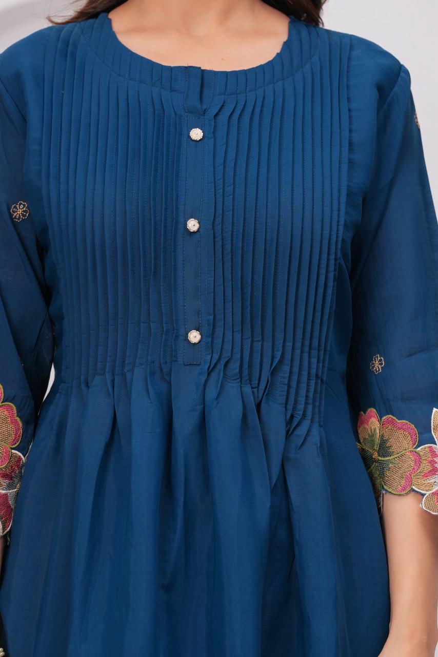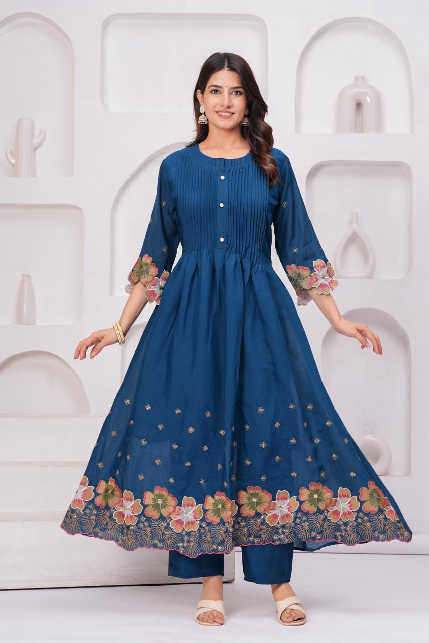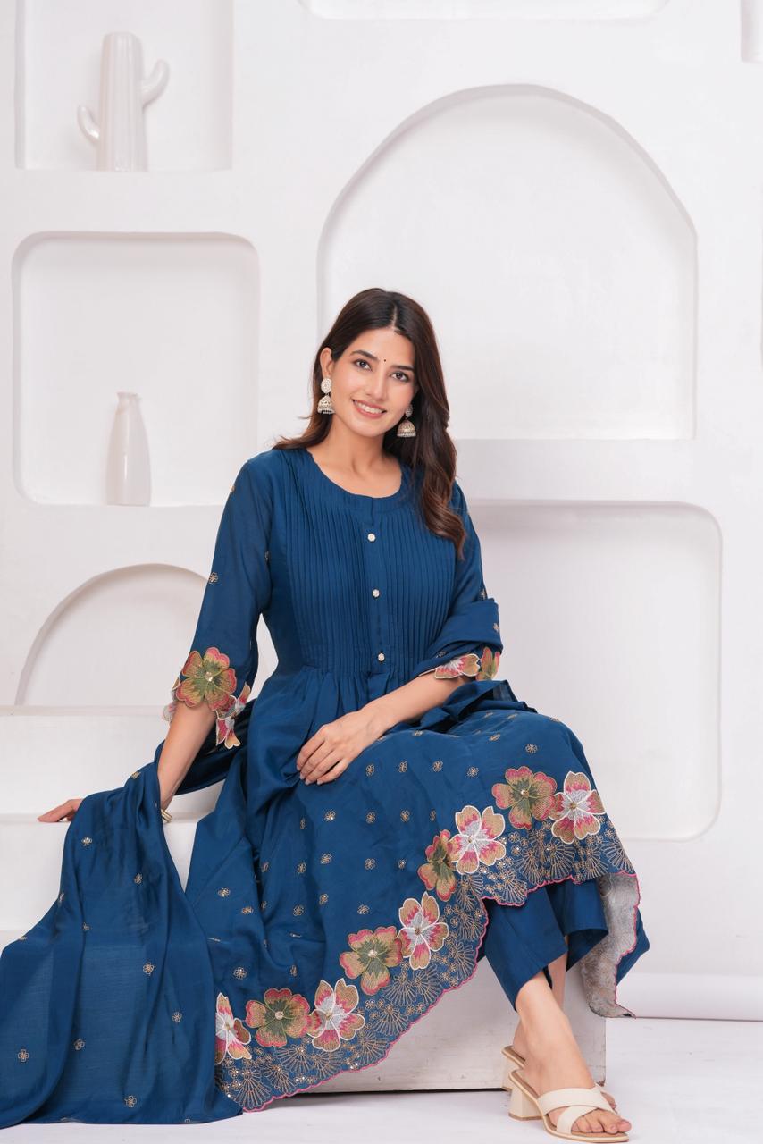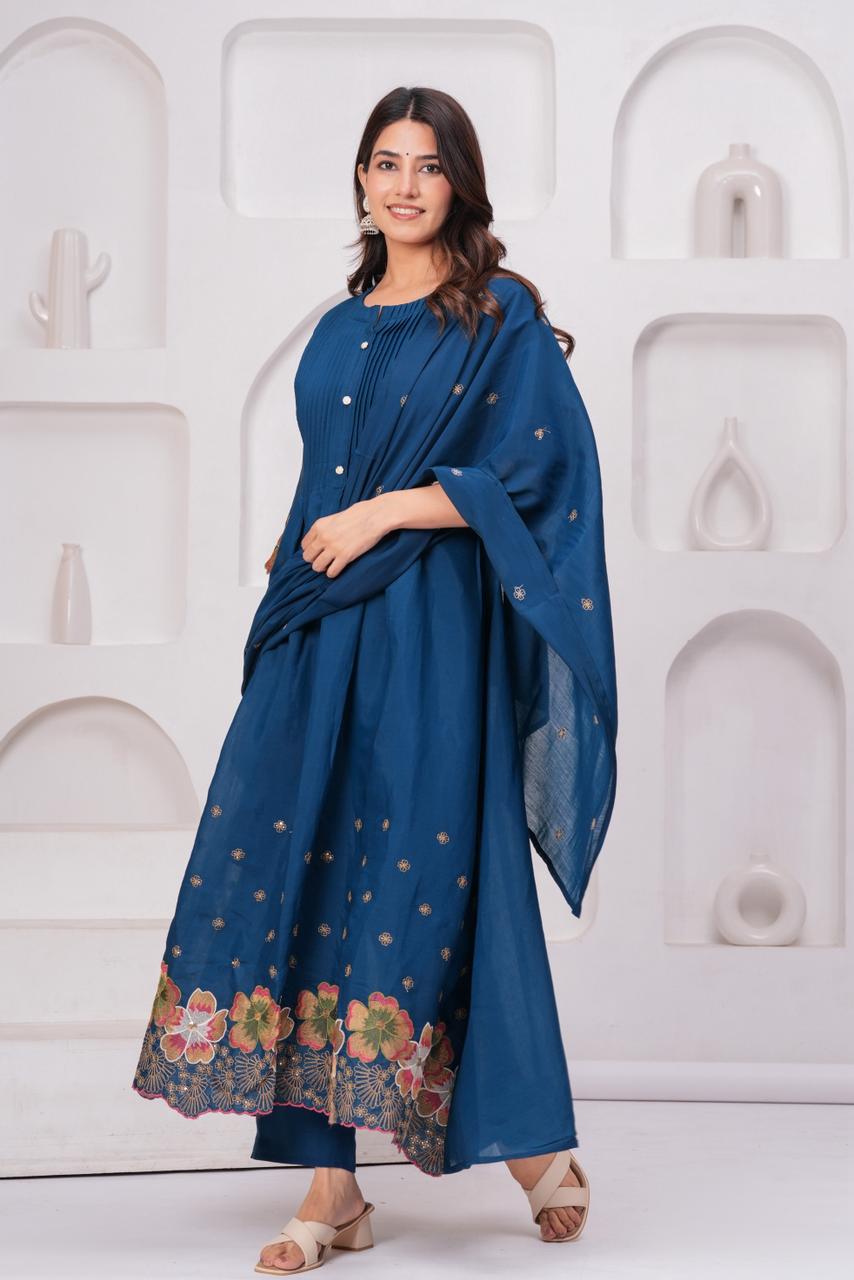 Royal Indigo Charm – Pure Mul Chanderi Embroidered Suit Set