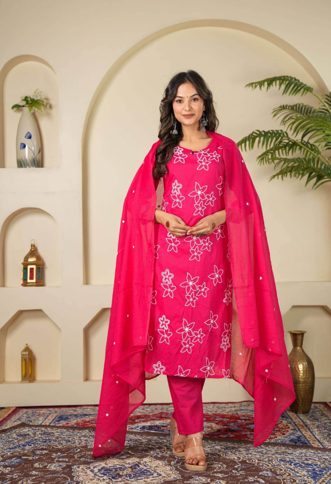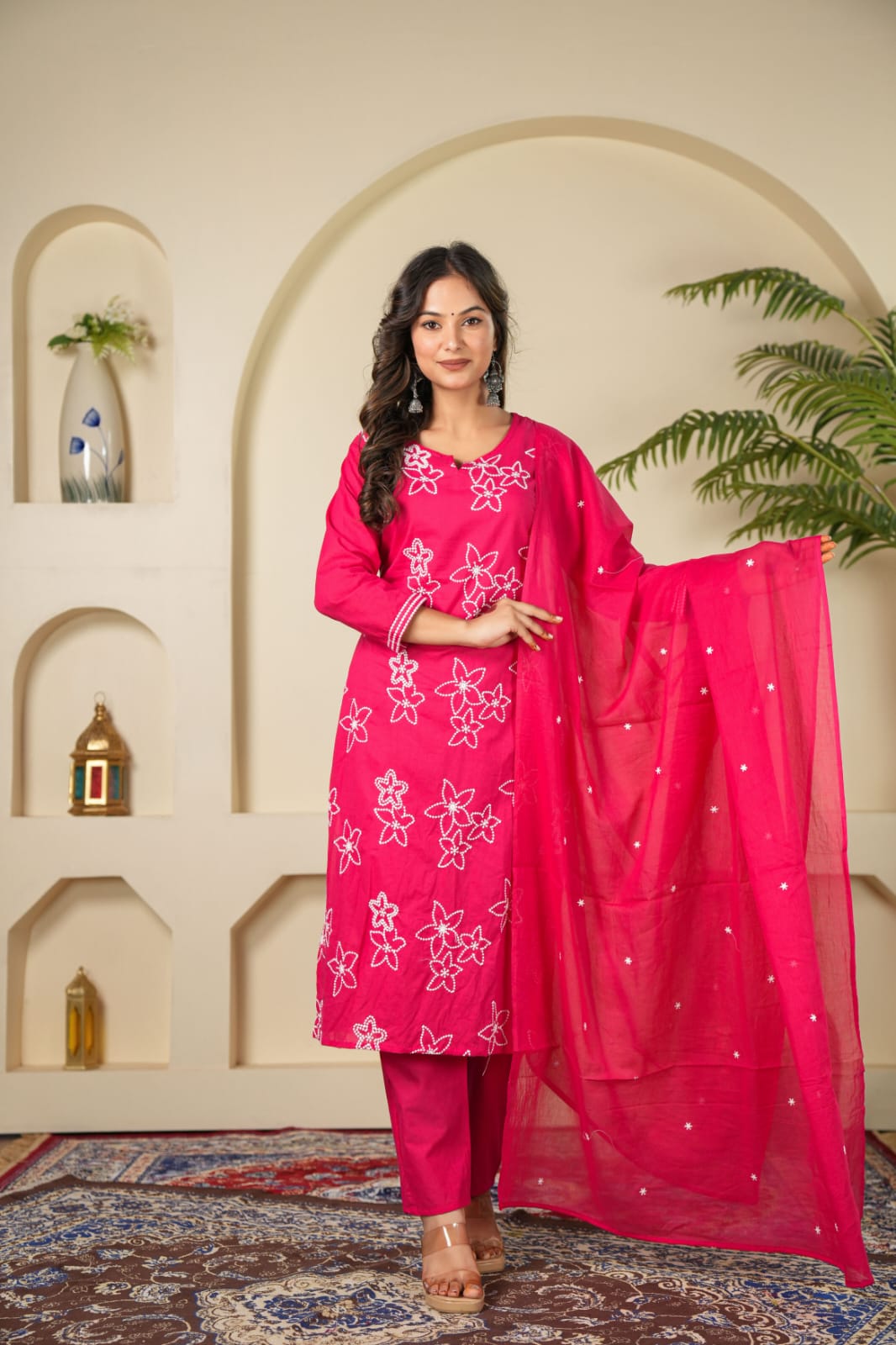 Graceful, comfortable, and timeless – this Indolady Straight Kurta Pant & Dupatta Suit Set is crafted from pure cotton fabric for an effortlessly elegant look. The kurta features intricate Aari embroidery on the front, adding a touch of traditional artistry to its simple silhouette. Paired with a matching cotton pant and a coordinated dupatta, this suit set beautifully balances comfort with festive charm.