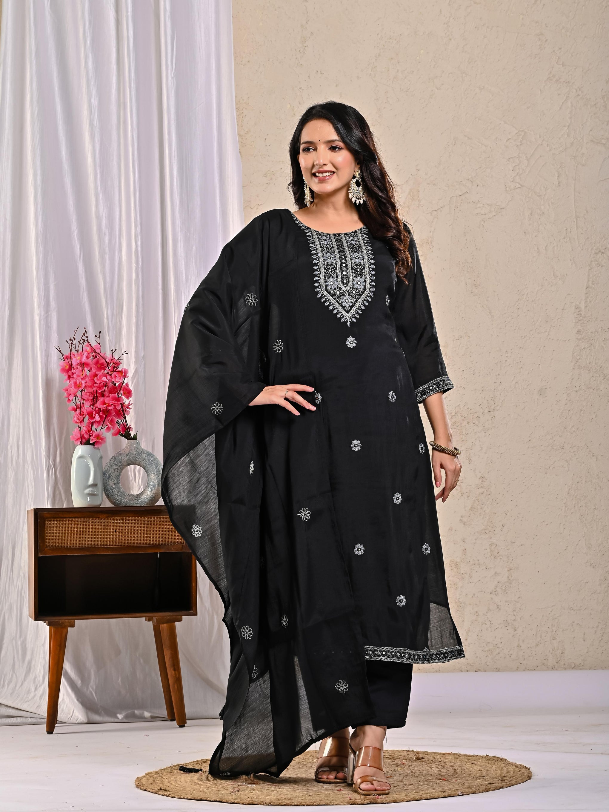 The kurta is adorned with exquisite all-over embroidery, beautifully complemented by matching pants and a richly embroidered dupatta, creating a complete festive statement outfit. Whether it’s a wedding function, festive gathering, or special party, this suit set is sure to make heads turn.
