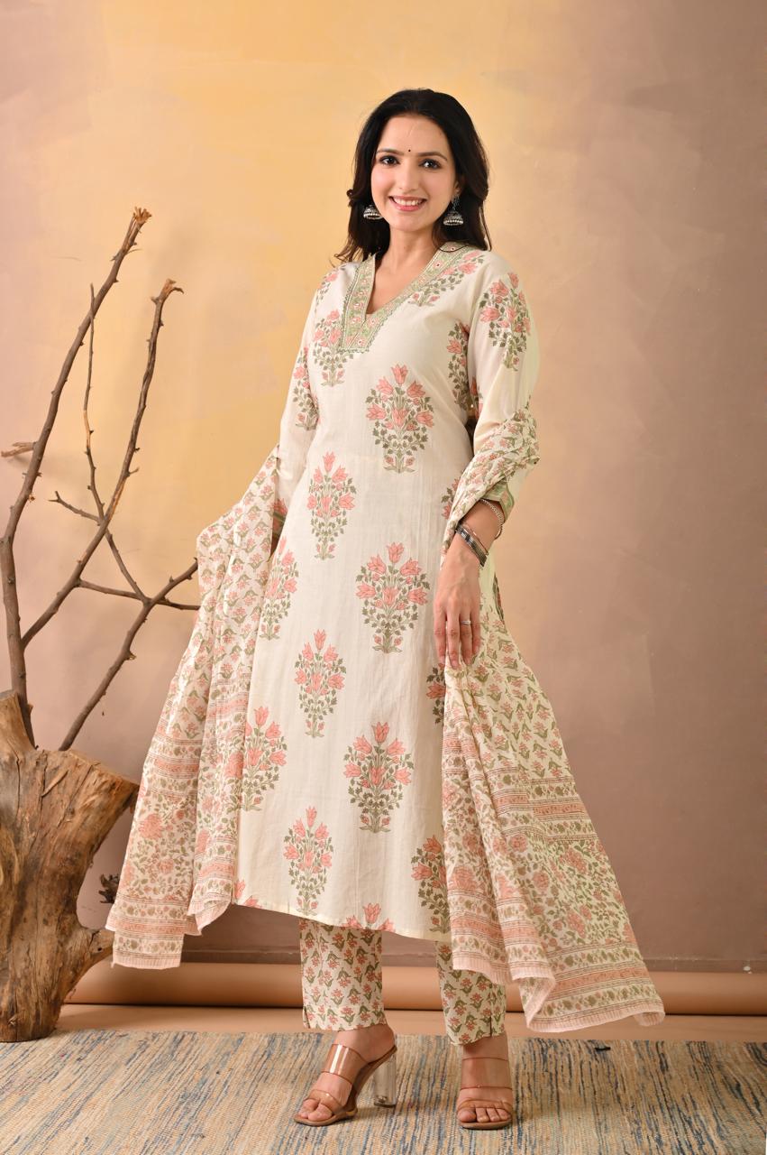 Step into timeless elegance with Indoladyโs Ethereal Grace Block Print Suit Set, thoughtfully handcrafted in pure cotton for breathable comfort and natural flow. The serene white base is adorned with delicate hand block prints, creating a soft visual rhythm thatโs soothing yet striking.