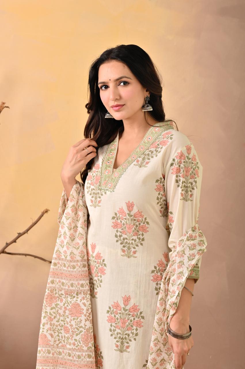 What makes this piece truly special is the hand embroidery on the neckline โ subtle artistry that brings attention to detail without overpowering the look. Whether you're dressing for a festive brunch, a calm morning ritual, or an intimate get-together, this suit set is your perfect blend of tradition and grace.