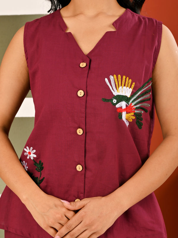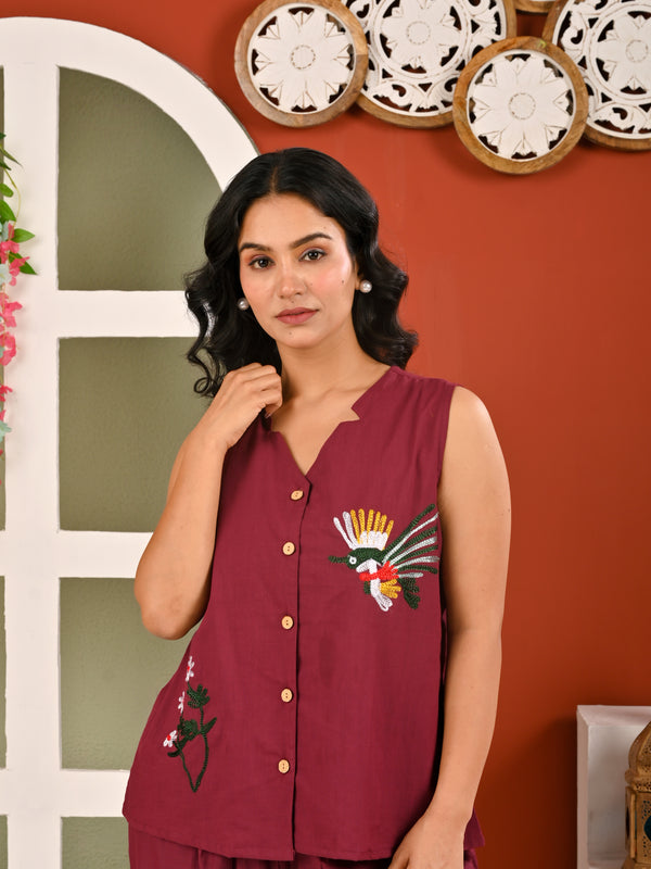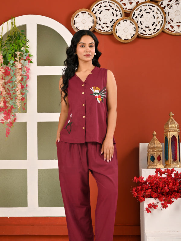 Refresh your wardrobe with this stylish Wine Whisper Sleeveless Co-ord Set from Indolady, crafted in breathable cotton slub fabric. Featuring a front-buttoned sleeveless top with elegant bird embroidery and relaxed-fit pants, this set combines comfort with effortless elegance. It's a versatile addition to your wardrobe, perfect for casual outings, vacations, or a relaxed festive vibe.