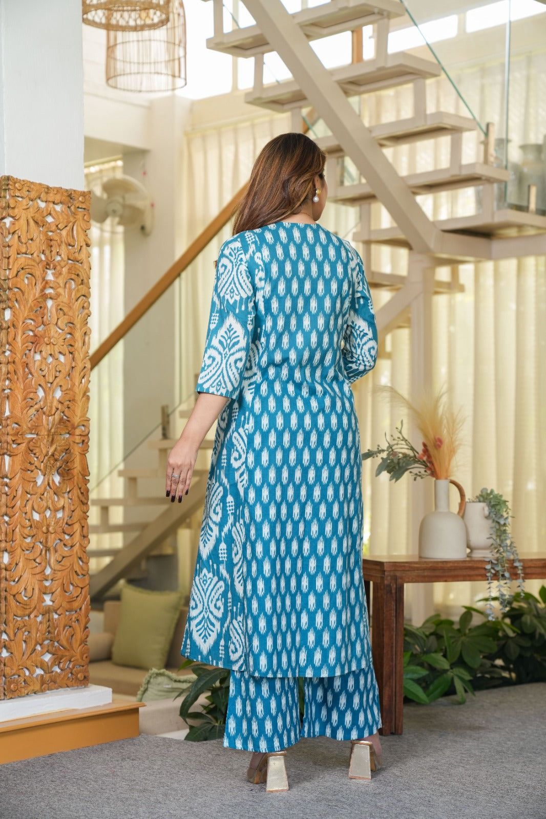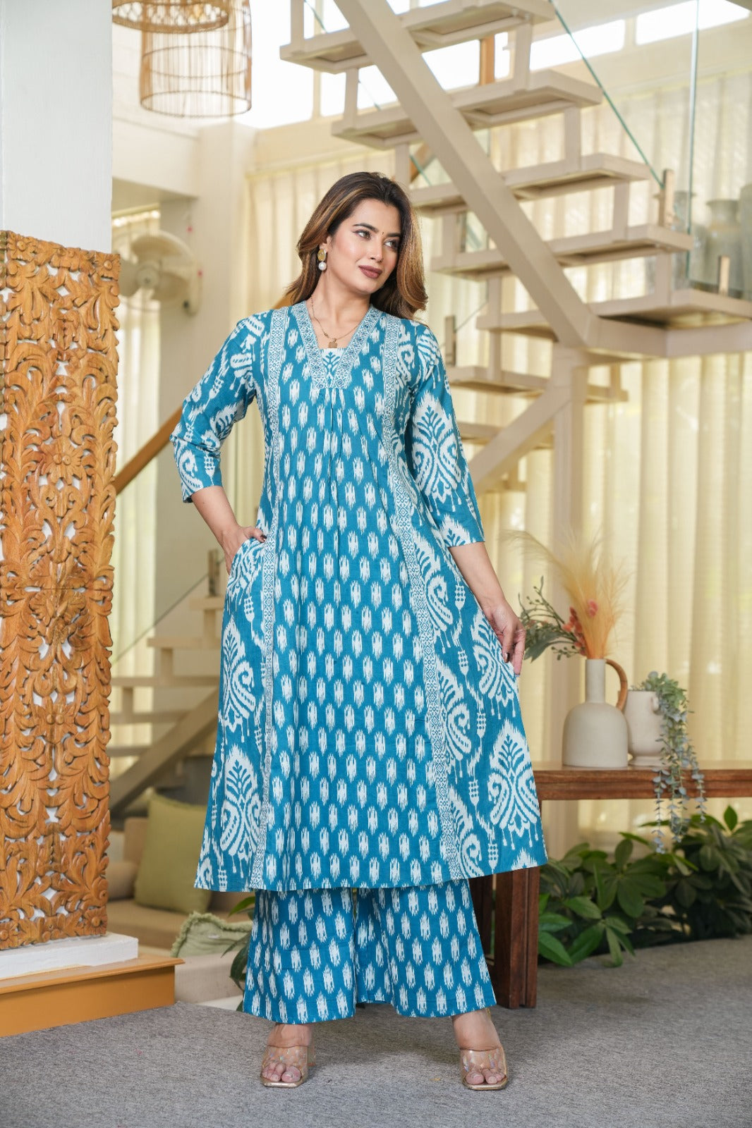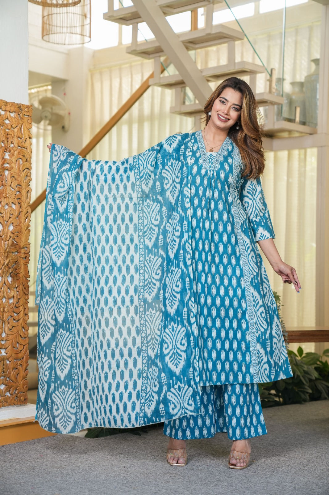 Infuse a fresh breeze into your ethnic wardrobe with the "Neel Tara - Sky Blue Cotton Suit Set. The calm, cool blue base is beautifully enhanced with all-over traditional style white prints that give a rich look while staying lightweight and fuss-free. Designed to keep you comfortable all day long, this three-piece set includes a fitted yet relaxed kurta, printed trousers, and a soft matching dupatta that completes the look with flair.