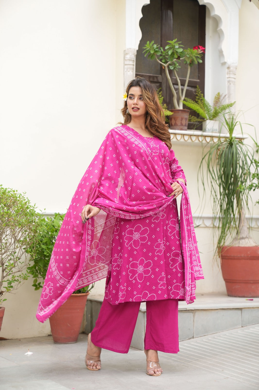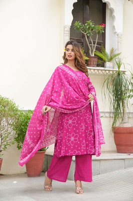 Brighten up your day with our Pink Bandhej Cotton Suit Set, featuring an A-line kurta that blends tradition with modern chic. The lightweight cotton fabric promises comfort, while the striking bandhej print and floral patterns make it a standout piece. Complete with a matching dupatta and pants, this set is perfect for festive occasions, casual outings, or workwear. Available in sizes M to XXL for effortless style and fit.