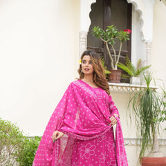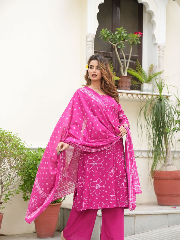 "Vibrant Pink Bandhej A-Line Cotton Suit Set"
