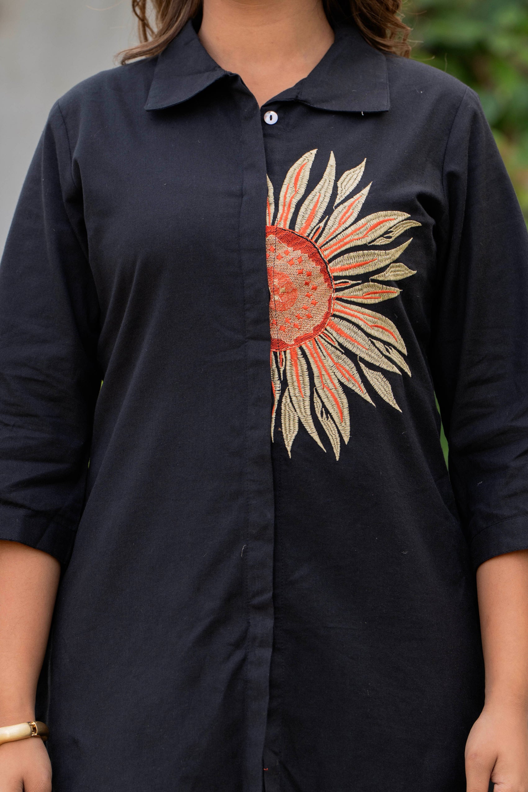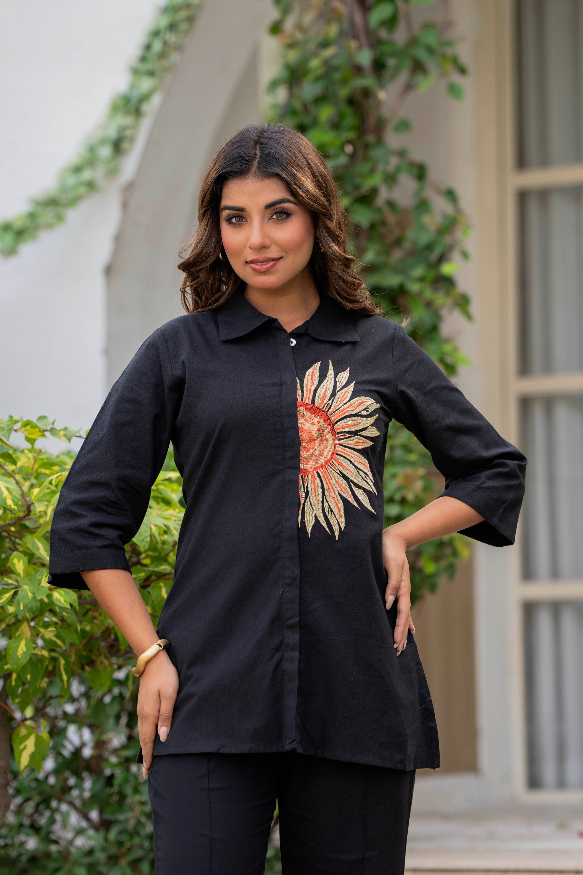 Made from high-quality cotton flex fabric, the outfit promises breathability, durability, and all-day comfort. The highlight of the ensemble is the beautifully hand-embroidered sunflower motif on the top — a symbol of confidence and warmth. This embroidery adds a vibrant pop to the minimalist silhouette, making it equally suitable for formal meetings, festive brunches, or casual evening outings.