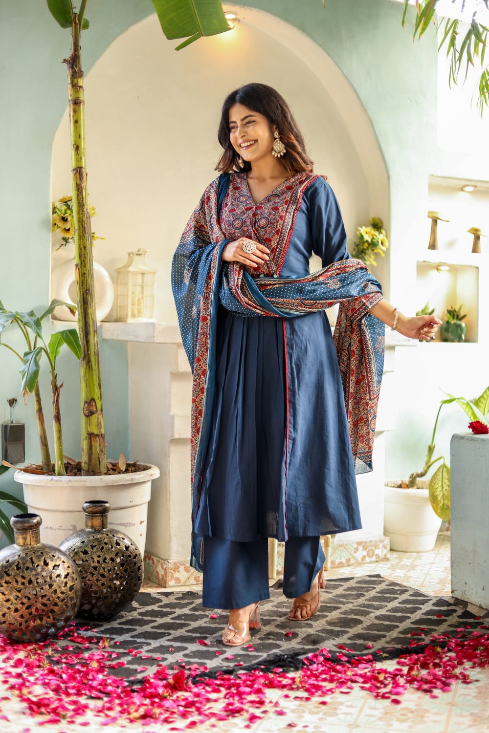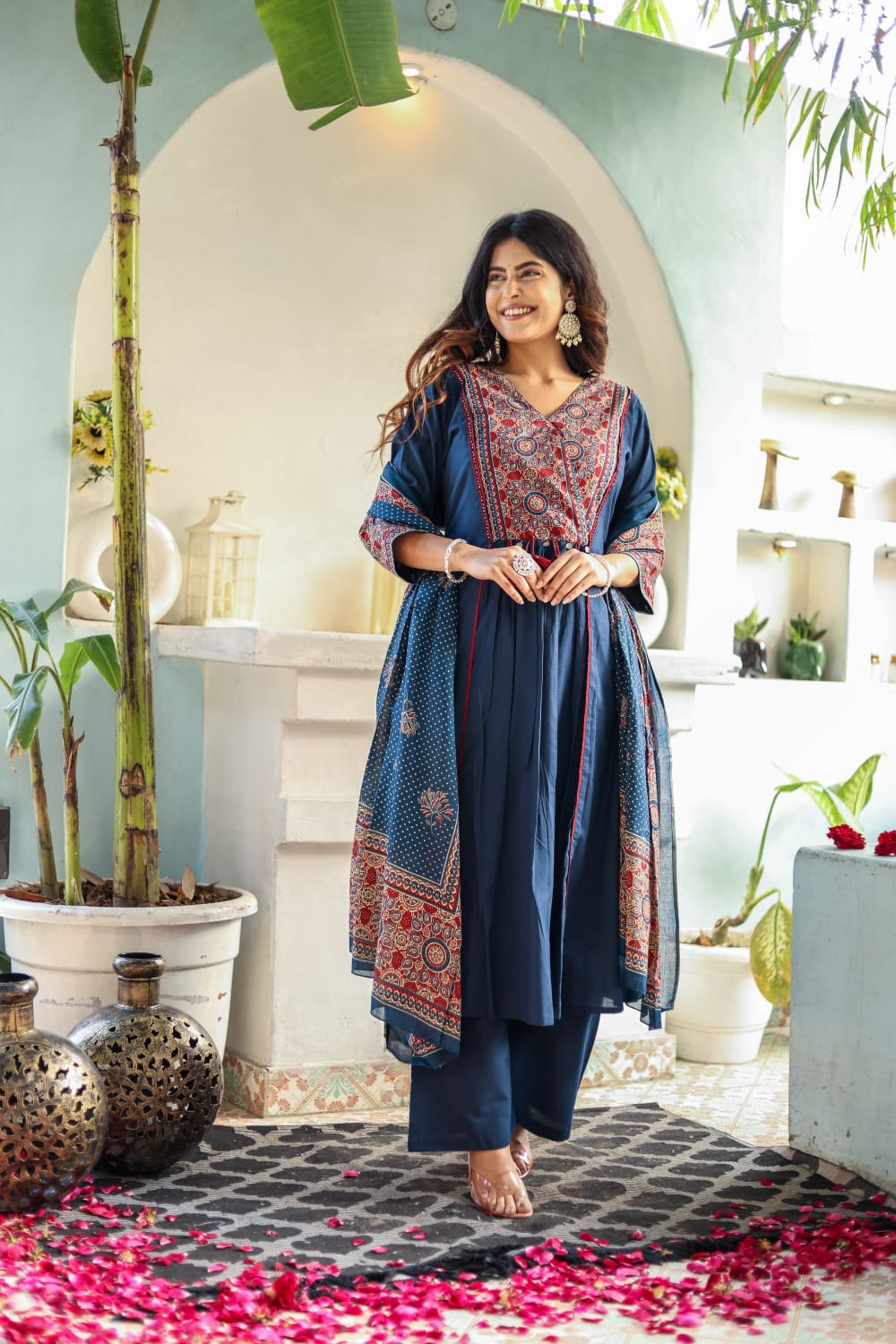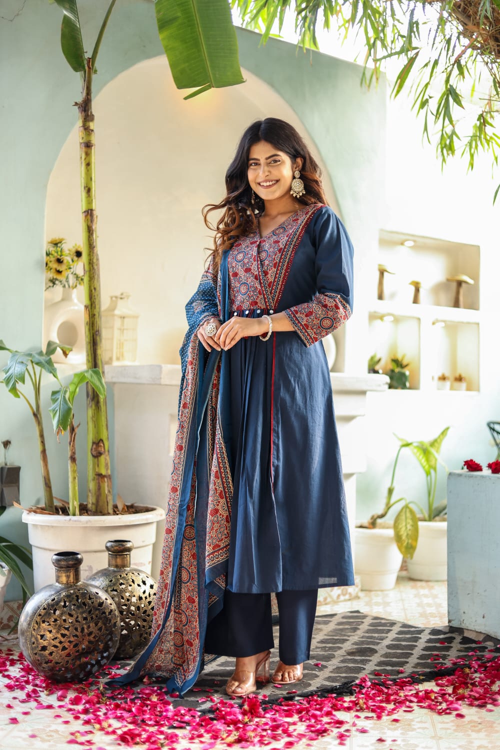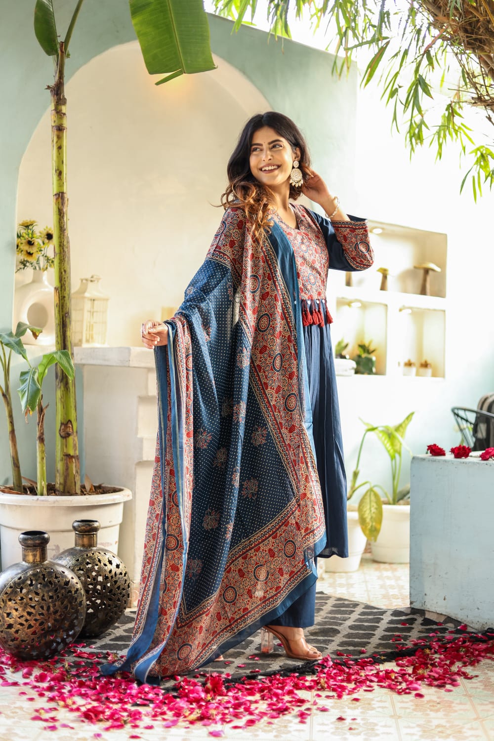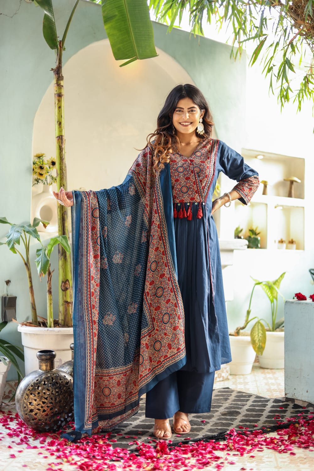 The set is completed with a matching cotton pant and an airy dupatta enhanced with coordinated tassels that add playful movement. Whether it’s a festive event or a casual ethnic day, this set promises comfort with a regal twist.