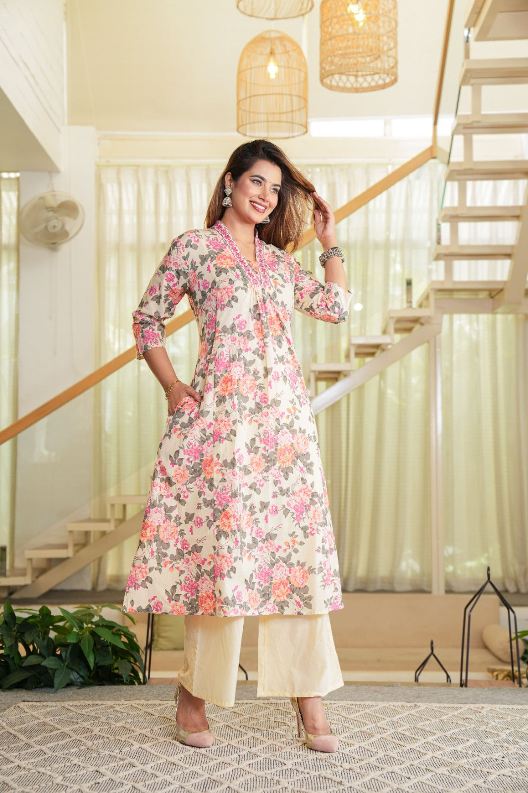 A-line/straight-fit kurta with graceful gathers under the yoke.