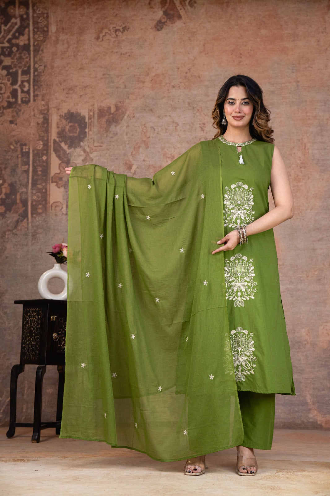 Olive Bloom Sleeveless Cotton A-line Suit Set with Elegant Dupatta – Indolady Skip to content