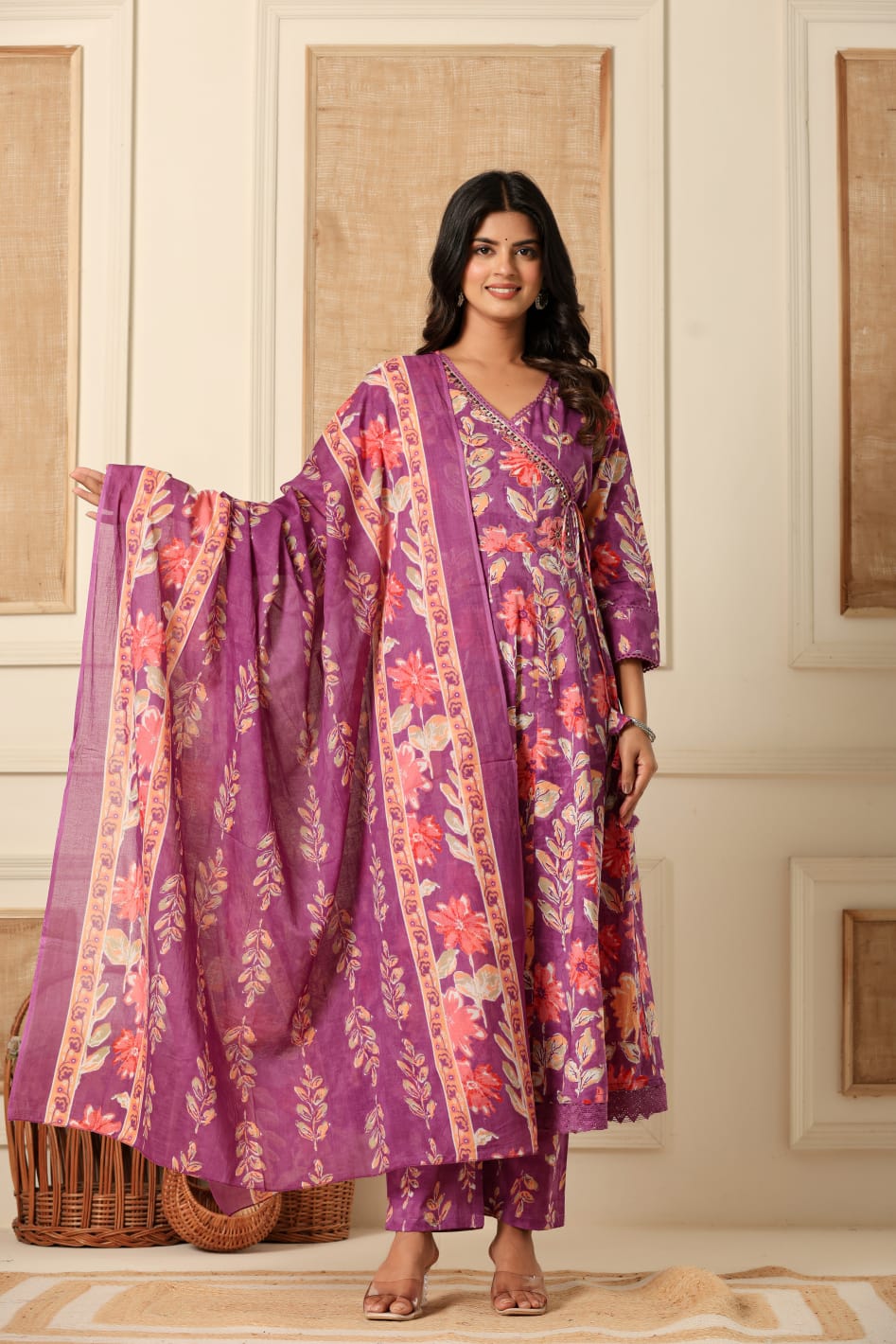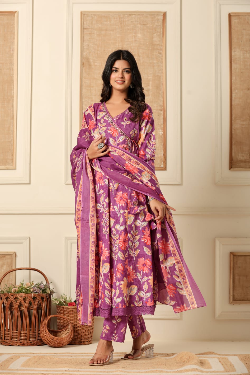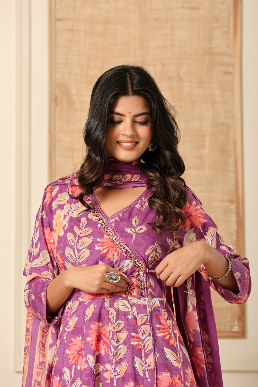 Step into a world of blooming elegance with the Phoolwari Hand-Embroidered Angrakha Suit Set from Indolady. This vibrant ensemble, crafted from pure cotton in a rich lavender purple base with multicolor floral patterns, ensures comfort with every twirl. The hand embroidery adds an artisanal charm, making it a perfect choice for festive occasions and elegant daywear.
