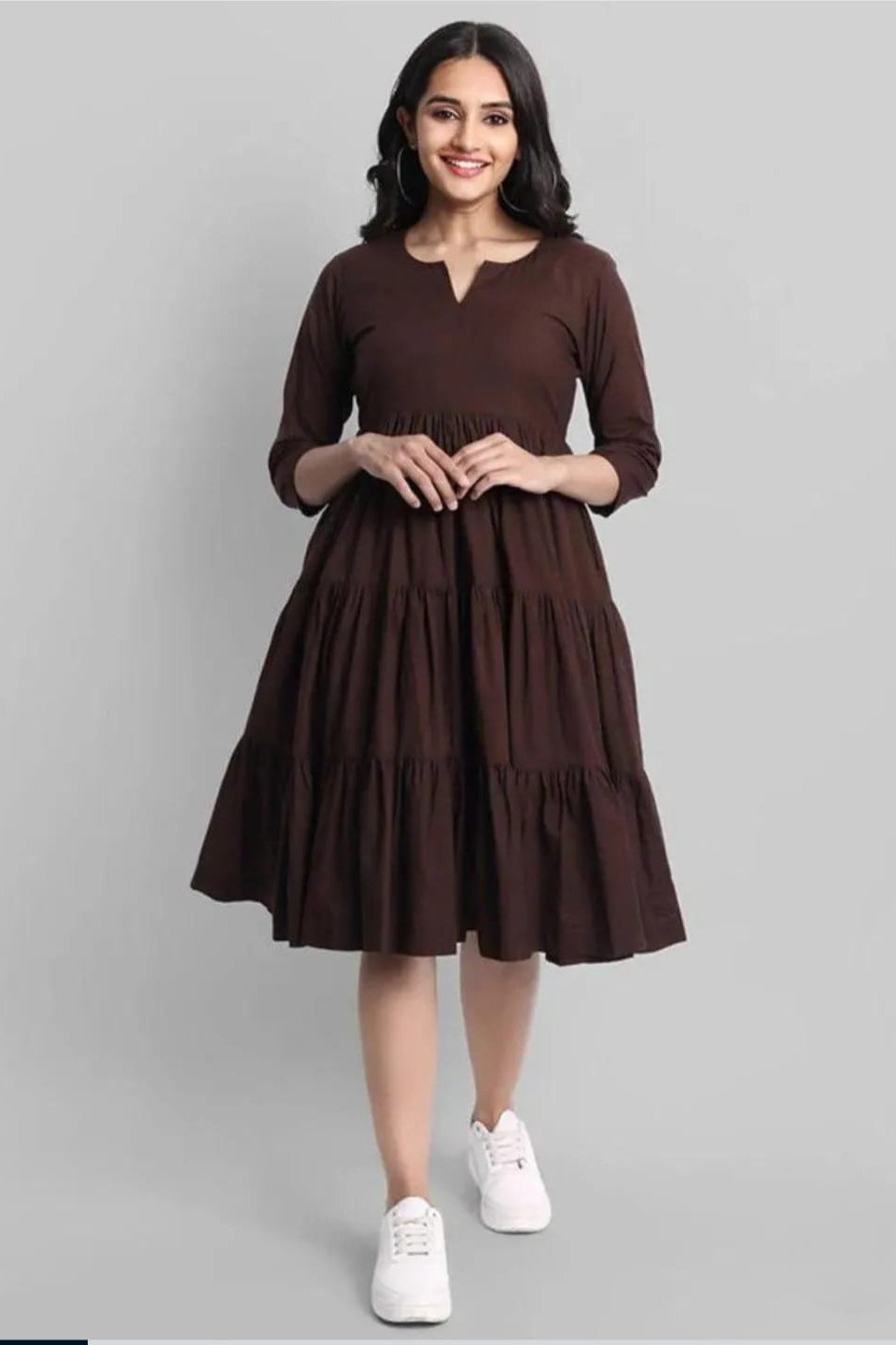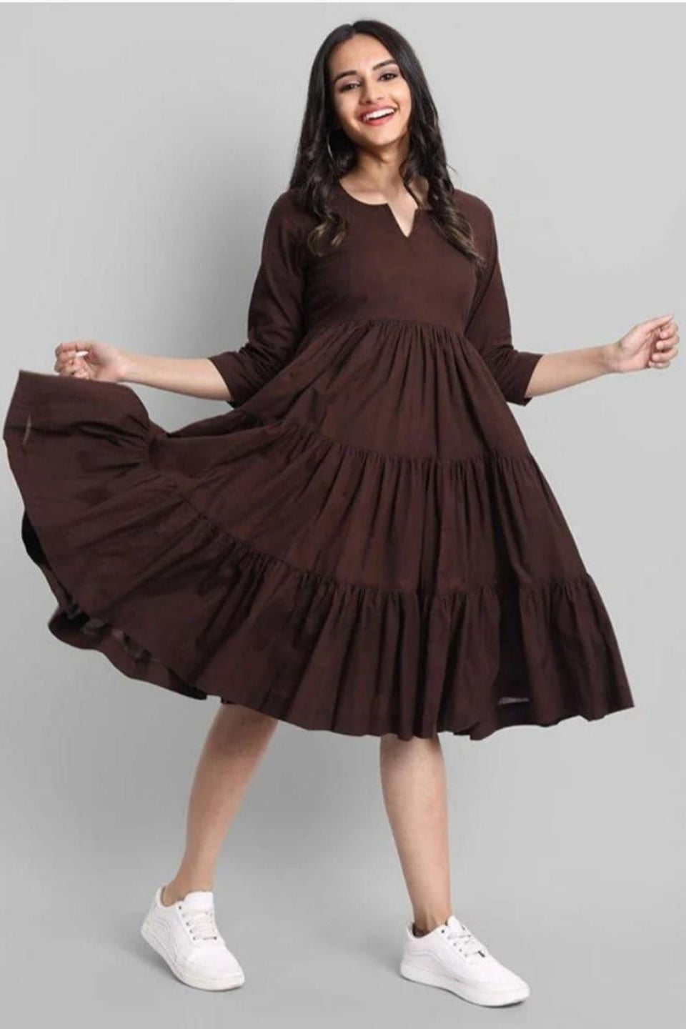 Add a playful charm to your wardrobe with this vibrant brown flared tier dress from Indolady. Crafted in soft rayon, this knee-length dress features a flattering V-neckline, full sleeves, and a voluminous tiered silhouette that moves beautifully with every step. Pair it with sneakers or flats for a chic casual look that’s effortlessly stylish.