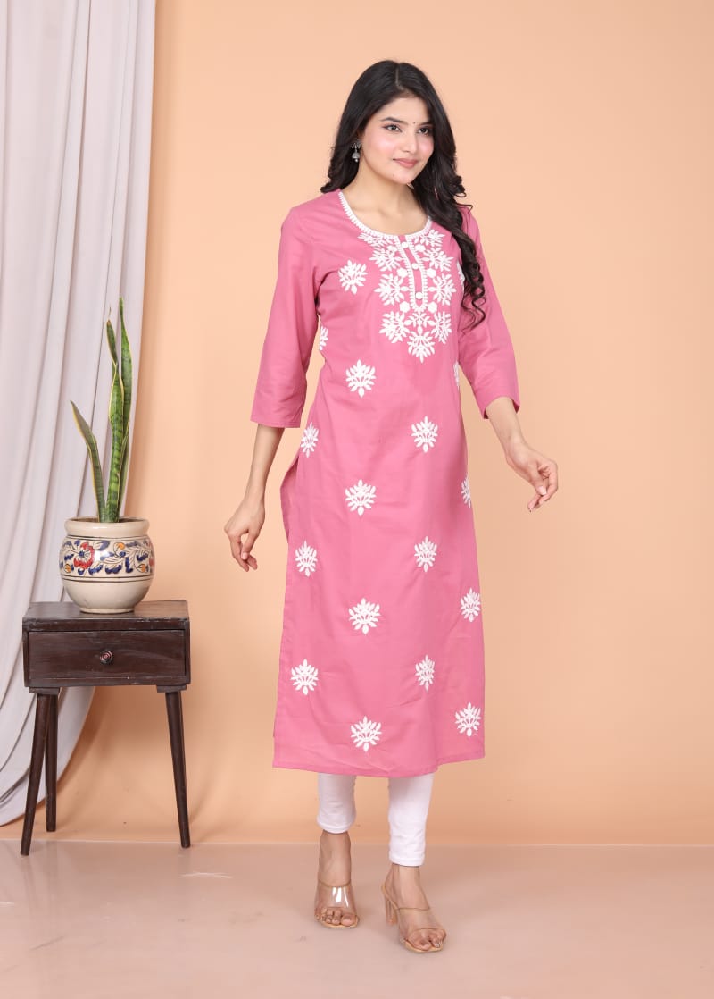 Refreshing Baby Pink Cotton Chikankari Kurti | Ethnic Embroidered Straight Fit