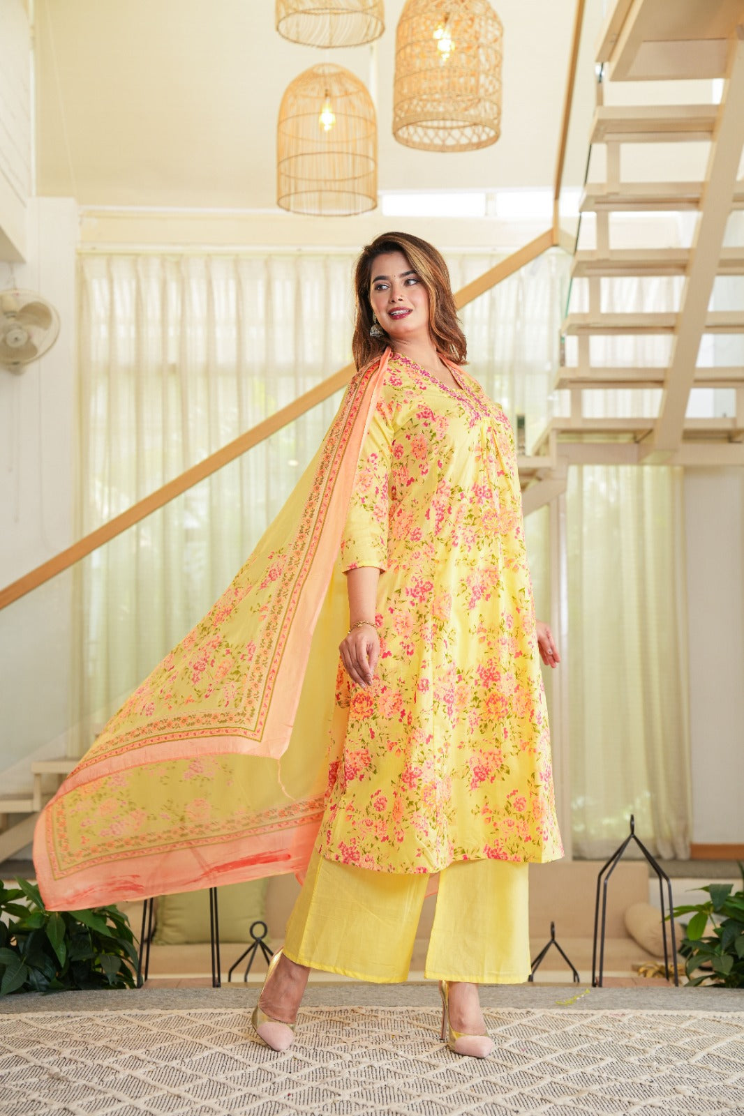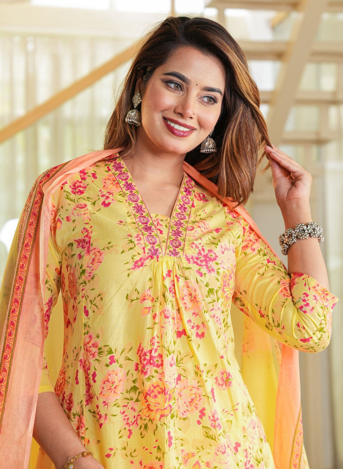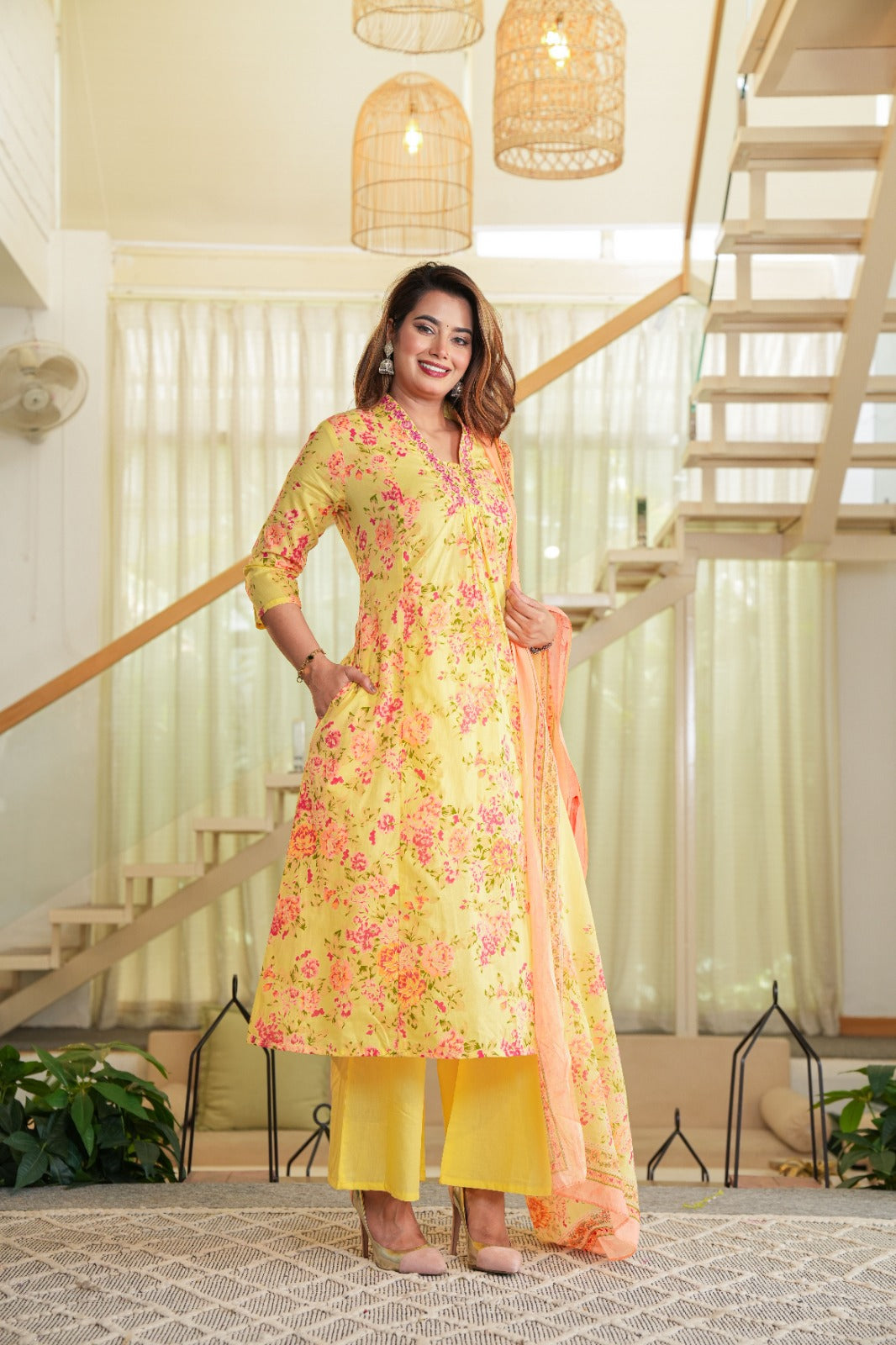 Step into a world of elegance with our Golden Glow – Mustard Yellow Floral Kurta Pant Set, designed for women who adore comfort and sophistication.