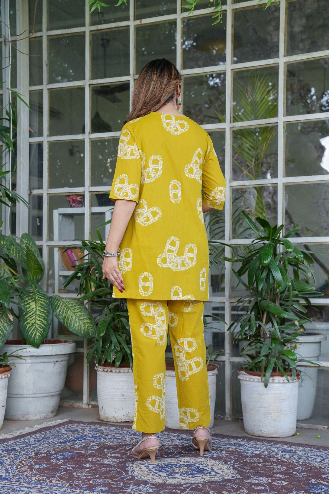 Radiate positivity and sunshine wherever you go with our Sunlit Harmony Cotton Co-Ord Set in a refreshing mustard yellow shade. This set is your ultimate go-to for when you want to keep things comfy yet stylish. With its calming earthy tone and artistic printed patterns, it delivers a clean, contemporary look that’s effortlessly chic.