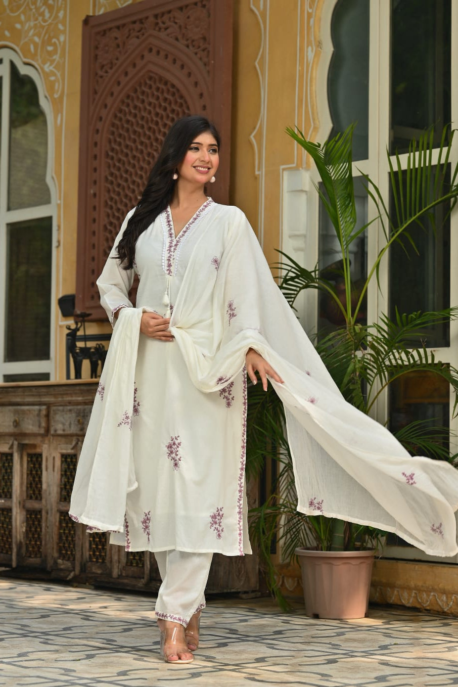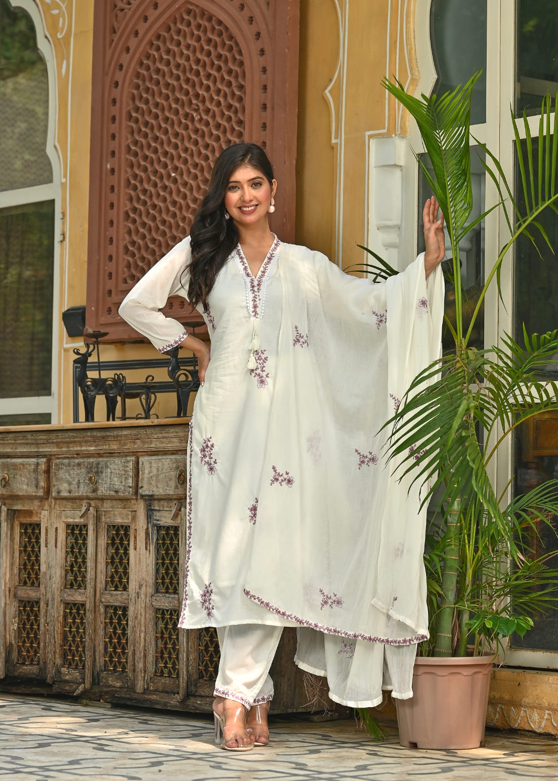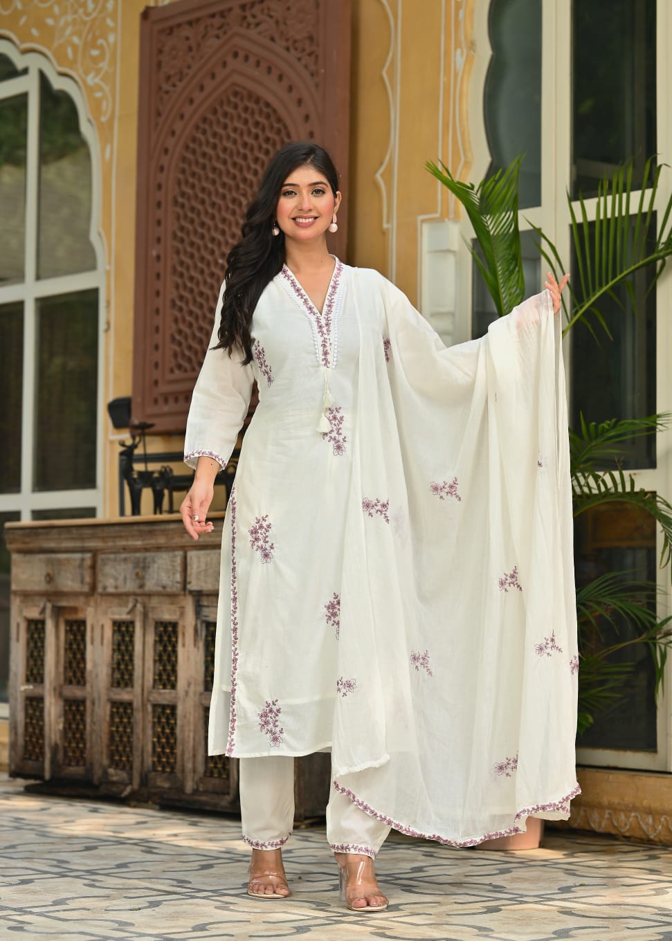 Step into the world of effortless grace with our Serene Pearl – White Muslin Ethnic Set with Floral Threadwork & Dupatta, an ensemble that speaks of simplicity, poise, and refined traditional aesthetics. Tailored from feather-light muslin cotton fabric, this three-piece suit set is designed to offer unmatched comfort while maintaining a luxurious ethnic appeal.