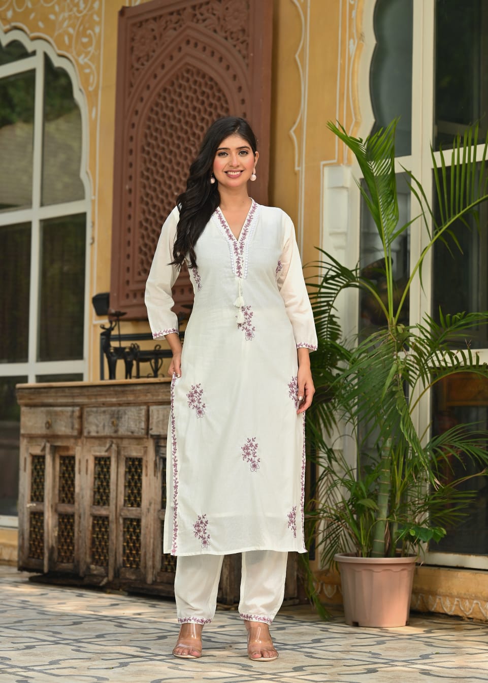 The kurta features a flattering straight-cut silhouette with delicate purple thread embroidery motifs scattered thoughtfully across the front and sleeves. The neckline is accentuated with intricate hand-finished details and subtle lace touches, making it ideal for both festive gatherings and intimate celebrations. The 3/4th sleeves and side slits add ease of movement and style.